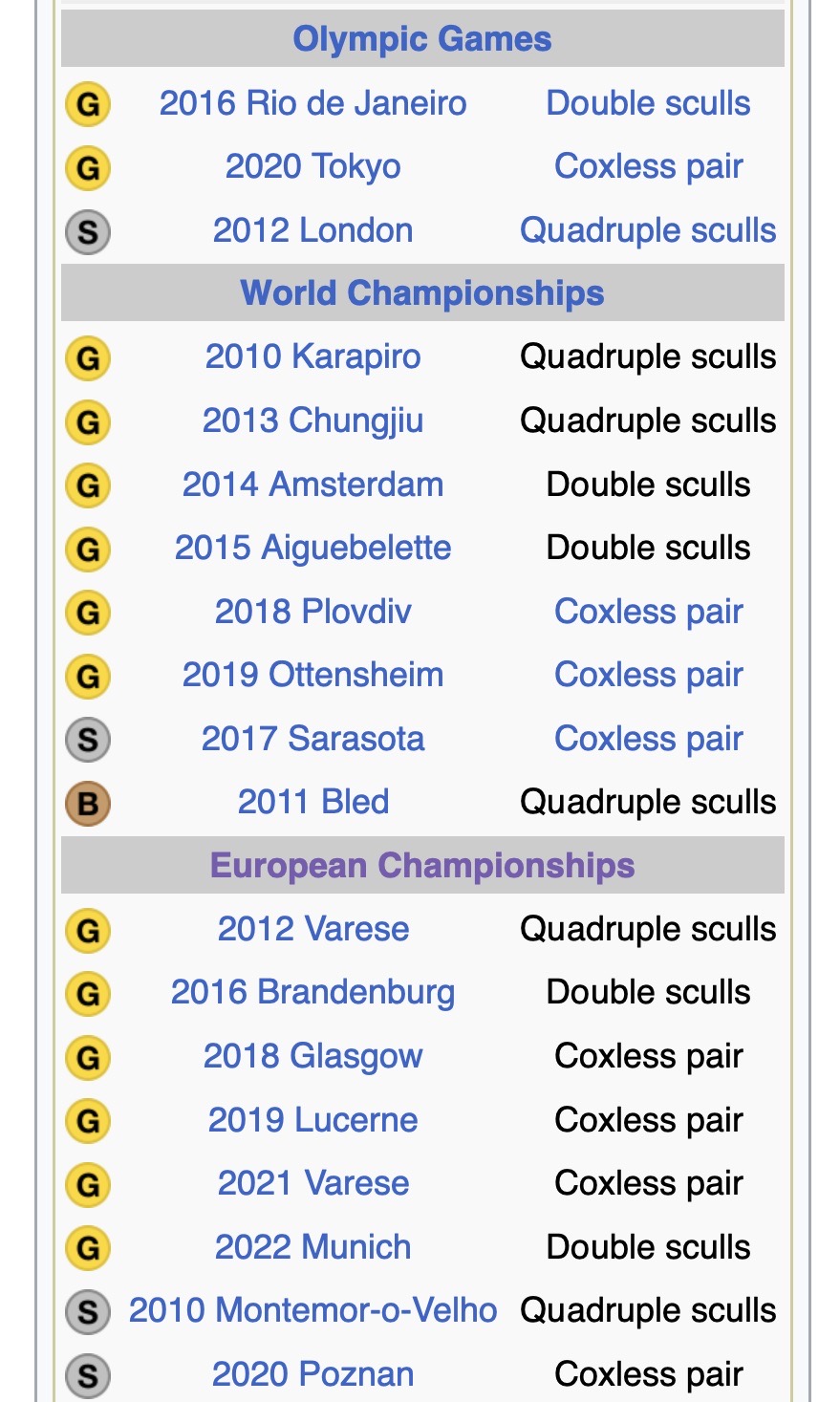 This table has not been updated to include the brother’s 2022 return to the double sculls. They had a hat-trick of wins at all three World Cups and gained another European title – though they came fourth at the Worlds.