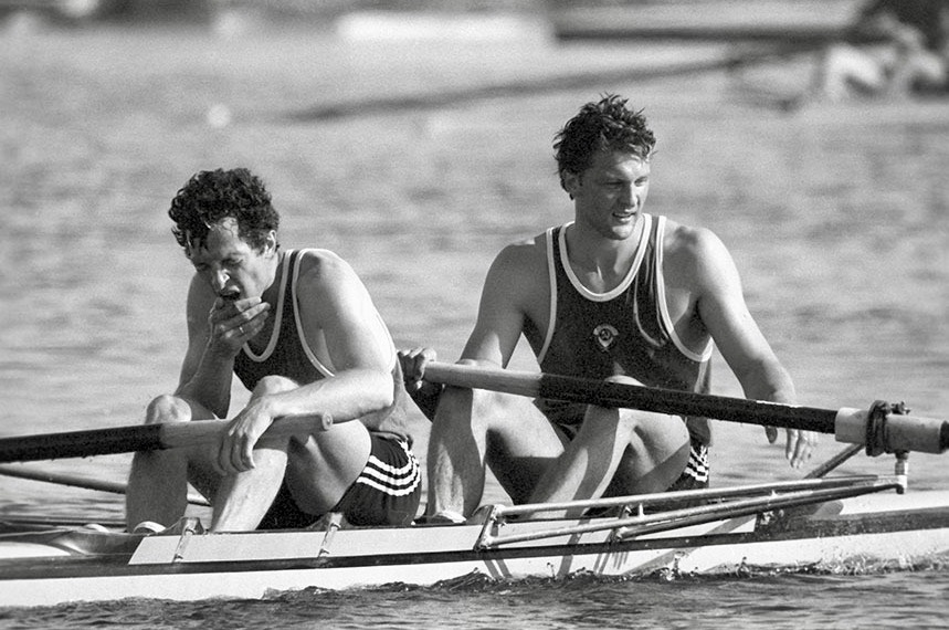 I made a study of films of the Pimenovs, and they were probably the cleanest in and the cleanest out of all rowers in the world. They were distinctly different-sized twins, but they made it work. They smoked cigarettes relentlessly, in and out of the boat. I’ve actually seen them smoking in the boat, and in the dining hall they would constantly be told they weren’t supposed to be smoking, but they did. Their starts were phenomenal, and often they held on to win, but their tendency to falter in the last 150 meters was their undoing in many, many races. I think there must have been two or three major races where they were rowed through by the end, and I wondered if some of their losses weren’t a result of their smoking.