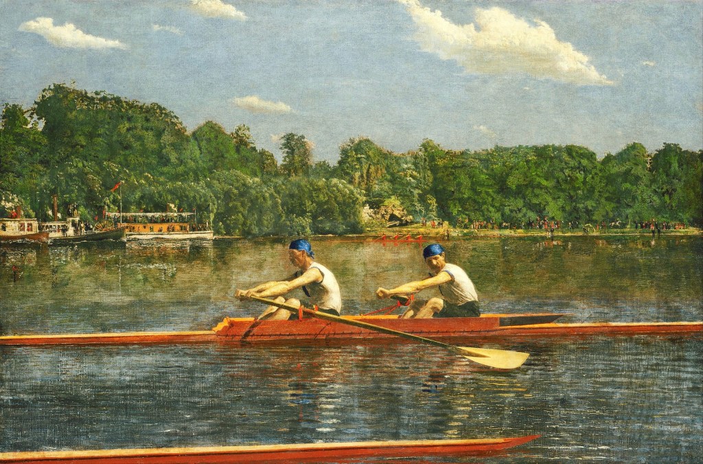 If the Biglin brothers, John, James and Barney, veterans of over a hundred races, are more famous than the Wards, this is probably because they were immortalised in a series of eleven well-known paintings by Thomas Eakins. This picture shows John and Barney racing Harry Coulter and Lewis Cavitt (not shown) in 1872. Image: National Gallery of Art.