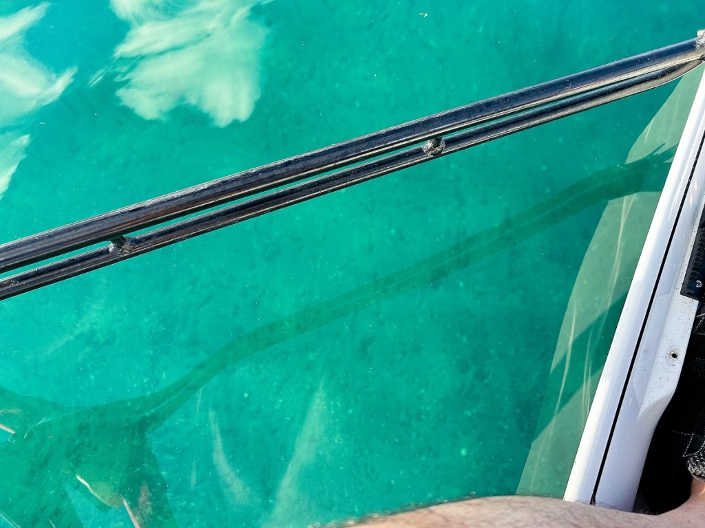 As the morning sun climbs higher, the water is arguably even clearer than at sunrise. This fact is evident from a photo shot looking down through the rigger of your correspondent’s scull. The sandy bottom some six to eight metres below is crystal clear.