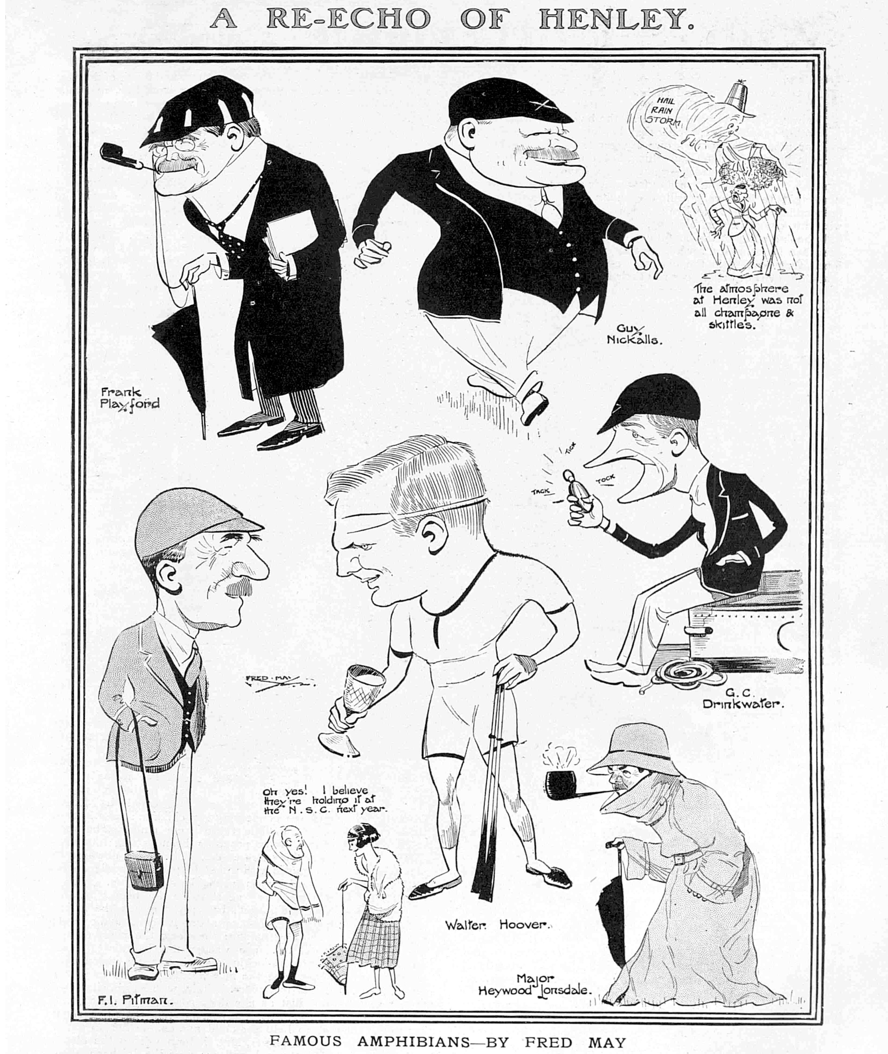 HTBS Types with good memories may recall that, three years ago, I posted three articles under the headline title “May Time”. In each part, I took a set of caricatures by magazine cartoonist Fred May that depicted some of those attending Henley Royal Regatta in 1920, in 1921 and in 1923 and produced a brief biography of each of the people that May’s pencil had affectionately captured. Having just found his caricatures for two more Henley Regattas, I will now repeat the process for 1922 and 1925.