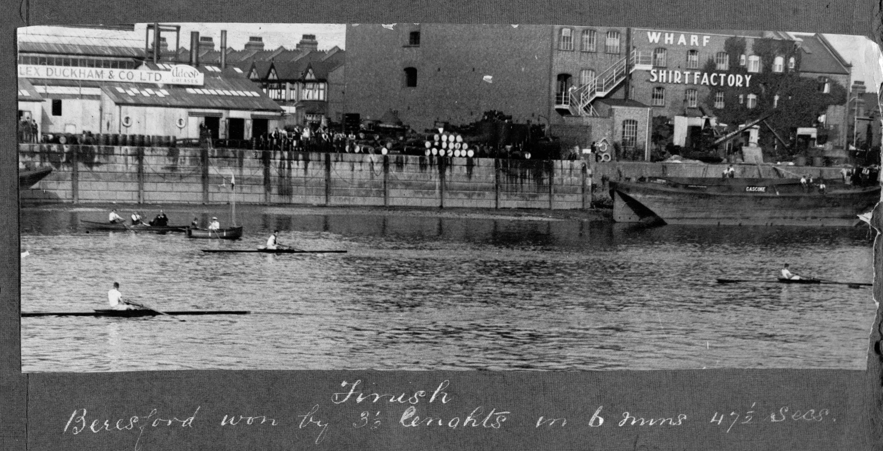 This unsatisfactory preamble was followed by an unsatisfactory race. Beresford led at the start but soon Hoover sculled into him. After the boats had broken apart, The Times noted that the two men raced “somewhat half-heartedly” and Beresford won by several lengths. The Times called Hoover “a fine racer and a gallant opponent” but held that he needed to rely “on his legs rather than his arms” and that he was handicapped by “too short a boat and too high a work, however great his courage…”