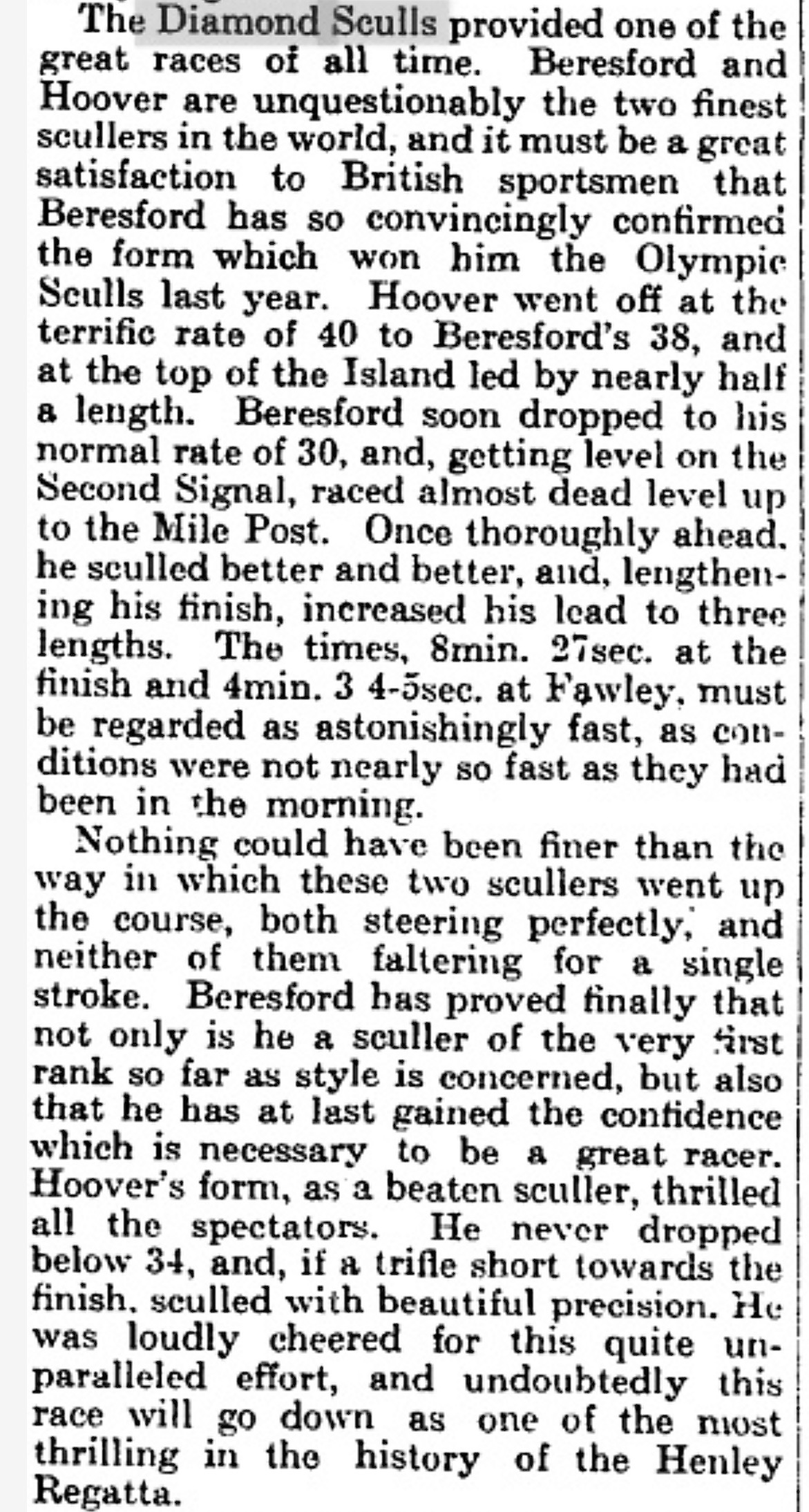 At Henley, Hoover easily won his two heats, including a victory over AA Baynes, the undefeated Australian sculling champion. In the final, Hoover beat Britain’s best oarsman of the pre-Redgrave era, the great Jack Beresford, by nearly 30 seconds, and immediately became famous. The Times wrote: