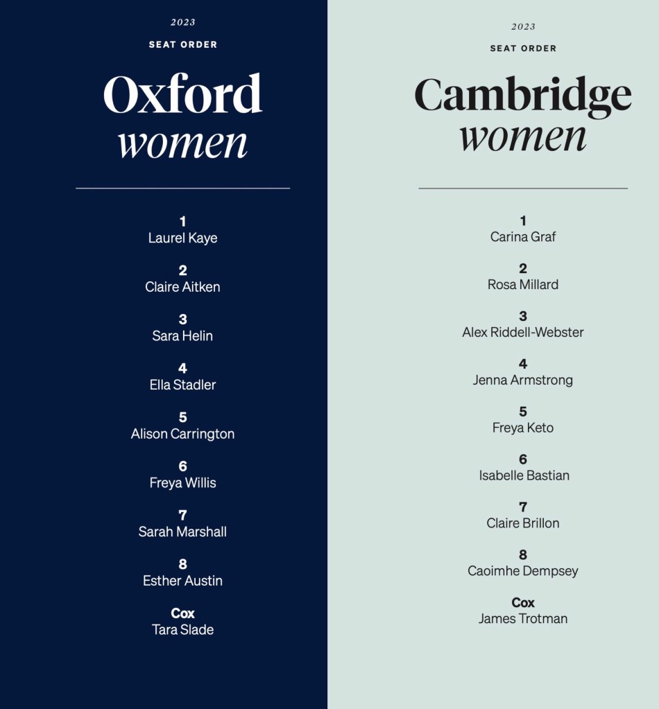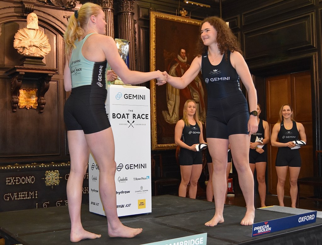 The women’s bows, Cambridge’s Carina Graf from Germany and Oxford’s Laurel Kaye from the US, take the stage at the 2023 Boat Race Crew Announcement. As last year, the women declined to be weighed.