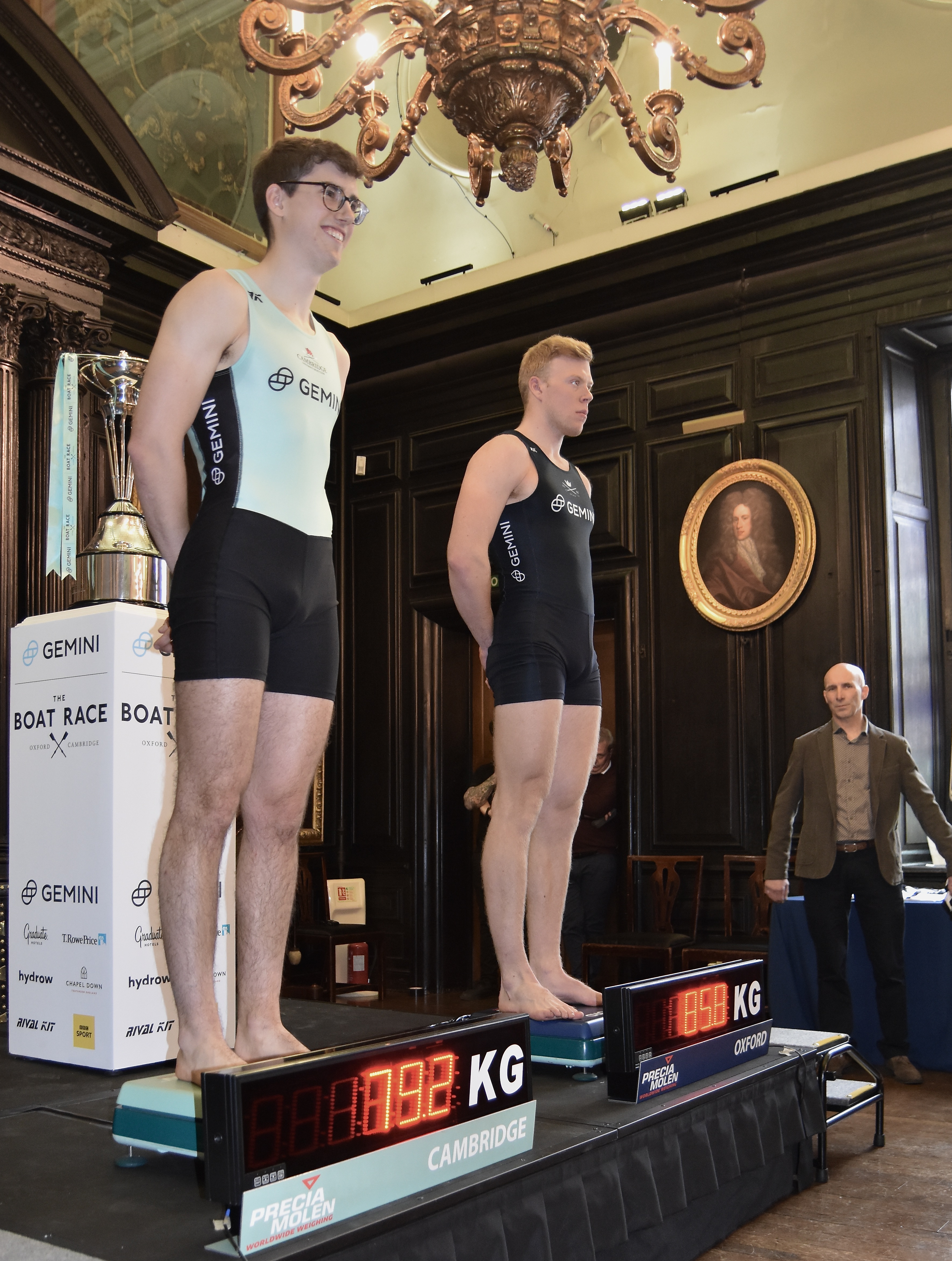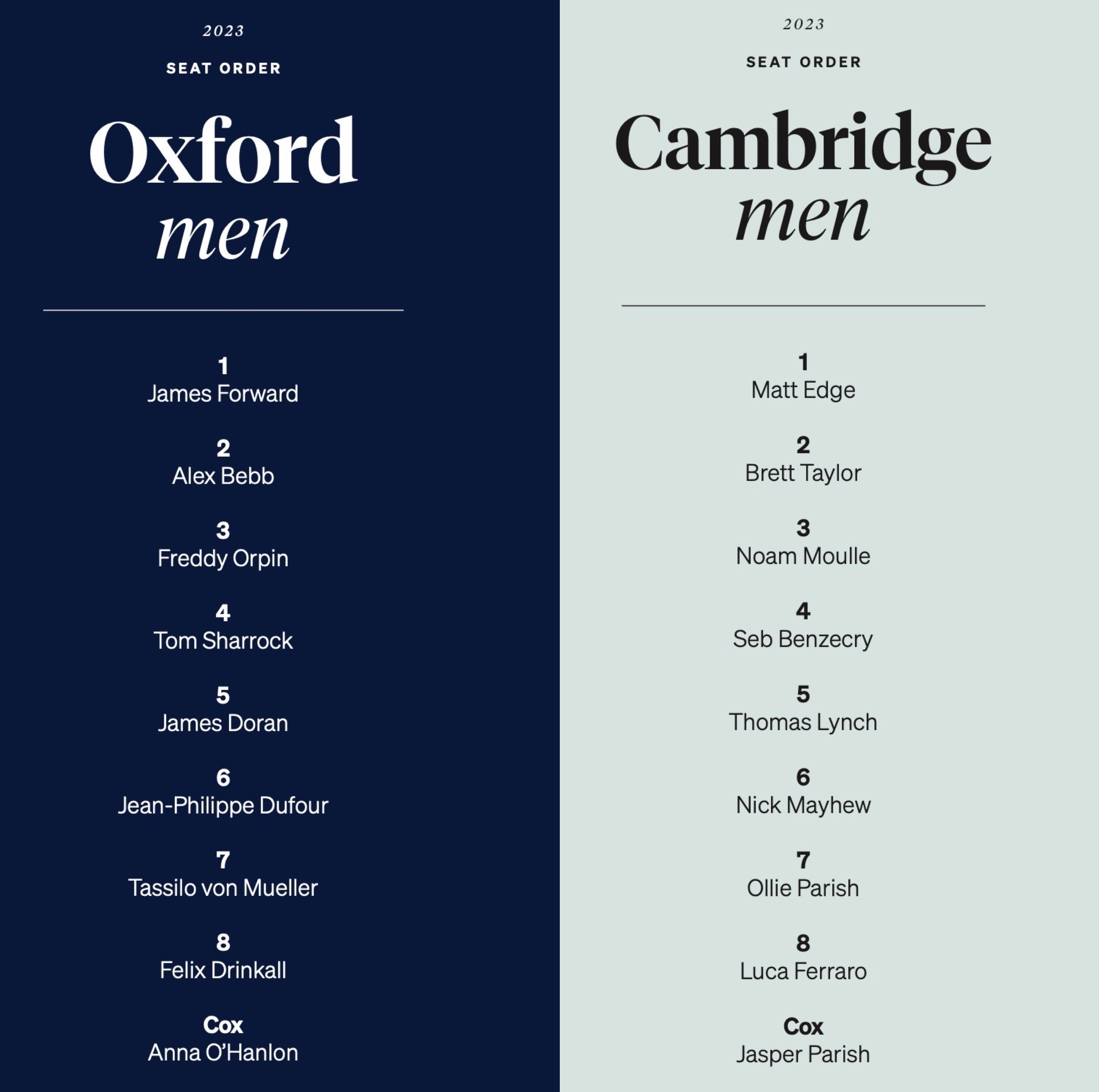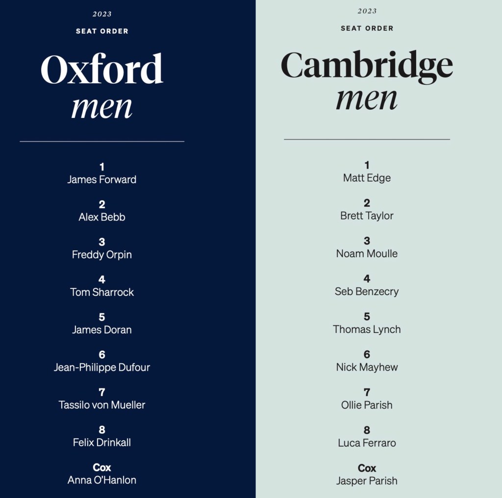 A “new tradition” was enacted when each athlete was presented with a Blues zephyr by their coach. Here, Cambridge women’s coach, Paddy Ryan, presents the Light Blue’s “2”, Rosa Millard, with her coveted vest.The “5s”, Freya Keto (USA/GBR) for Cambridge and Alison Carrihgton (GBR) for Oxford give each other the rowers’ secret handshake.Cambridge’s Claire Brillon (CAN) and Oxford’s Sarah Marshall (GBR) will be in their respective “7” seats.The Strokes, Caoimhe Dempsey, left, from Ireland and Esther Austin, right, from New Zealand.The crews and their coxes (James Trotman for Cambridge and Tara Slade for Oxford) are flanked by their coaches, Paddy Ryan for Cambridge and Andy Nelder for Oxford.A pause while the dais is set up for the men.Bowmen Matt Edge (Cambridge) and James Forward (Oxford) take the stand. The Oxford men’s coach, Sean Bowden looks on.In the “4” seats: Seb Benzecry for Cambridge and Tom Sharrock for Oxford.Swiss/Canadian Jean-Philippe Dufour and British/New Zealander Nicholas Mayhew will be in the “6” seats.Stroking Cambridge will be Luca Ferraro and stroking Oxford will be Felix Drinkall.The Boys in the Boats.Left to right, Matt Parish (CUBC 1994, 1995) with his sons, Jasper (CUBC Women’s cox 2022, CUBC Men’s cox 2023) and Ollie (CUBC 2021, 2022, 2023). The decision to put Jasper in the boat with his brother resulted in the unusual situation of the President, cox Ollie Boyne, not getting a place in the Blue Boat.In the courtyard of Apothecaries’ Hall, photographer Ben Tufnell captures the men’s crews.The Oxford Men from left to right. Bow: James Forward (Pembroke), 2: Alex Bebb (St. Peter’s), 7: Tassilo von Mueller (Hertford), 3: Freddy Orpin (St. Catherine’s), Cox: Anna O’Hanlon (Somerville), 5: James Doran (Oriel), Stroke: Felix Drinkall (Wolfson), 4: Tom Sharrock (Magdalen), 6: Jean-Philippe Dufour (Lincoln). The average weight (minus cox) is 91.95 kg.The Cambridge Men from left to right. 7: Ollie Parish (Peterhouse), Bow: Matt Edge (St Catharine’s), Stroke: Luca Ferraro (King’s), 5: Thomas Lynch (Hughes Hall), Cox: Jasper Parish (Clare), 3: Noam Mouelle (Hughes Hall), 4: Seb Benzecry (Jesus), 6: Nick Mayhew (Peterhouse), 2: Brett Taylor (Queens’). The average weight (minus cox) is 89.15 kg.The Oxford Women from left to right. Bow: Laurel Kaye (Worcester), Stroke: Esther Austin (St Anne’s), 4: Ella Stadler (Exeter), 7: Sarah Marshall (Jesus), Cox: Tara Slade (St Peter’s), 3: Sara Helin (St. Peter’s), 5: Alison Carrington (Hertford), 6: Freya Willis (Magdalen), 2: Claire Aitken (Oriel).The Cambridge Women from left to right. 3: Alex Riddell-Webster (Murray Edwards), 5: Freya Keto (St. Edmund’s), Bow: Carina Graf (Emmanuel), 7: Claire Brillon (Fitzwilliam), Cox: James Trotman (Sidney Sussex), 6: Isabelle Bastian (Jesus), Stroke: Caoimhe Dempsey (Newnham), 4: Jenna Armstrong (Jesus), 2: Rosa Millard (Trinity Hall).Oxford patiently waiting for the photographers to stop fiddling with their f-stops.Cambridge, also waiting for the snappers, find different ways of keeping warm on a cold day. The stars of 26 March 2023. Full crew biographies are here. Picture: Benedict Tufnell/Row360 via @theboatrace.Matthew Holland coxed the Cambridge Women to victory in 2017 and the Cambridge Men to the same result in 2019. So far this is a unique feat – but Jasper Parish could match it this year.