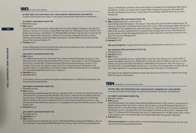 The bulk of the book consisted of three sections, compiled and written by this author and devoted to Y150 history: “A Brief History of Yale Lightweight Crew” (32 pages), “A Century or So of Harvard-Yale-Princeton Race Results and Boatings” (63 pages on those boatings and Sprints and IRA results) and “Yale Lightweights Abroad” (12 pages on Y150s in Henley Royal Regatta). Additional material included tables of Y150 captains and coaches and Y150 national team members.