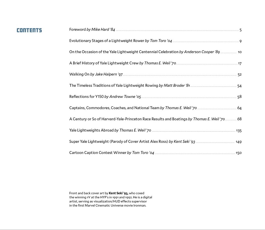 The principal contents included an introduction by Hard, and three essays: “Walking On” by Pulitzer Prize winner Jake Halpern ’97, “The Timeless Traditions of Yale Lightweight Rowing” by national team member Matt Broder ’81 and “Reflections for Y150” by national champion and Antarctic adventurer Andrew Towne ’05.
