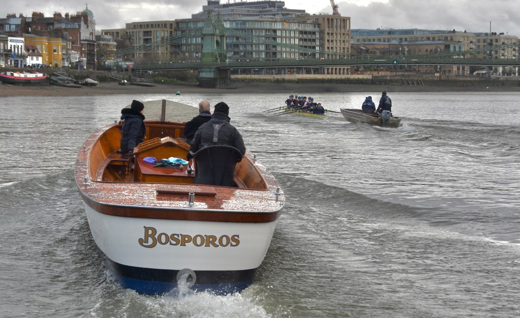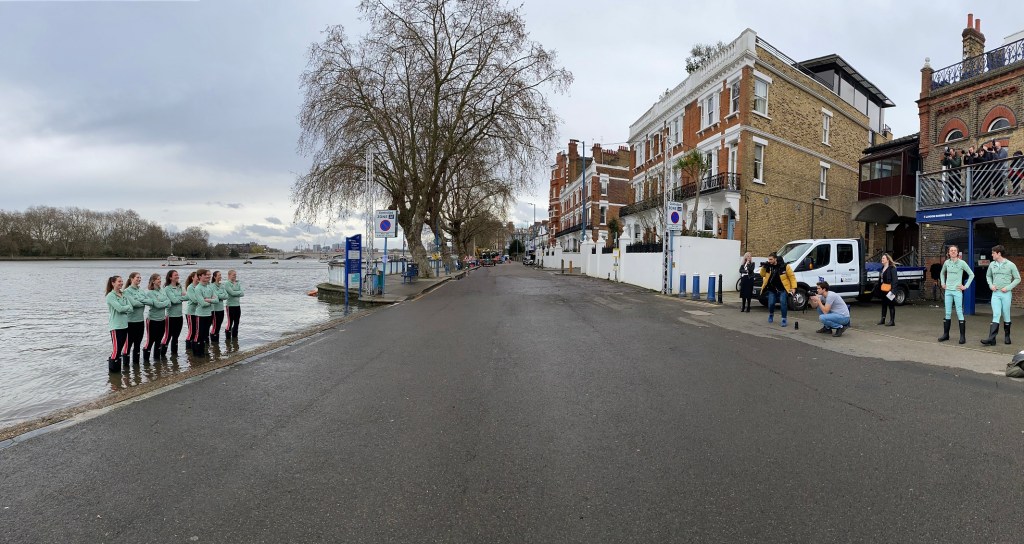 The Cambridge men’s reserves, Goldie, are debriefed outside Crabtree, the Cambridge alumni boathouse.The Oxford men’s Blue boat downstream of Hammersmith Bridge.Oxford returning to Putney followed by the OUBC launch, Bosporos.Oxford passing the apartment complex in the former Harrods’ Depository (once, the former Soap Works).An oar-bending practice start along the Putney Embankment.The Cambridge men shadowed by the CUBC launch, Amaryllis.Cambridge all square.A short burst for Cambridge at Hammersmith.The Oxford women’s Blue boat goes afloat.Approaching Harrods, the Oxford women pass the Cambridge reserve men.Practicing a racing start.The Cambridge women boating from Thames Rowing Club.Rosa Millard (“2”) seems to be going for an awkward sculling outing.The Cambridge women in action, a picture taken during a fixture race against University of London on 5 February.A “photo op” and interview session at London Rowing Club on Wednesday.The photographers decide to make the crews walk on water. Here, the Cambridge women have a go.The Oxford women say (Blue) cheese.A manly pose from Cambridge.No smiles from Oxford.Brothers-in-arms. Cambridge’s “7”, Ollie Parish (standing), and cox, Jasper Parish (sitting) pose for the photographers in the Members’ Room of London Rowing Club. Men’s race umpire, Tony Reynolds, and OUBC Coach, Sean Bowden (closest to the camera) survey high water at Putney from London RC’s balcony.Boats may no longer be built on Putney Embankment, but British craftsmanship is not dead.A reminder for spectators along the course that Hammersmith Bridge will be closed 11am – 6pm. Also, Barnes Bridge will be closed 2.30pm – 6pm. A man in a hard hat on Hammersmith Bridge told me that the problem is not the combined weight of any crowds but that too many people would set off some of the many sensors now monitoring the aged span.The official 2023 Boat Race Programme/Magazine is now available for free download. It is a great read, especially pages 56-58.