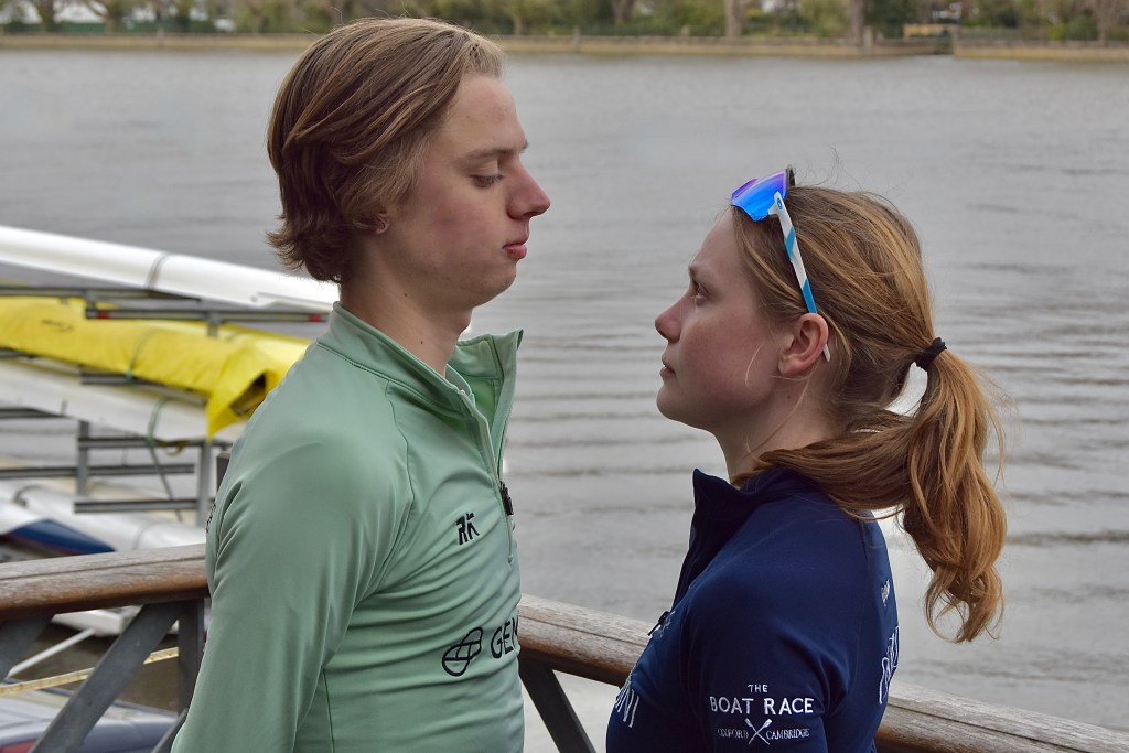 The men’s coxswains, Jasper Parish of Cambridge and Anna O’Hanlon of Oxford, obligingly respond to the assembled photographers’ request for a pugilistic stare-out.