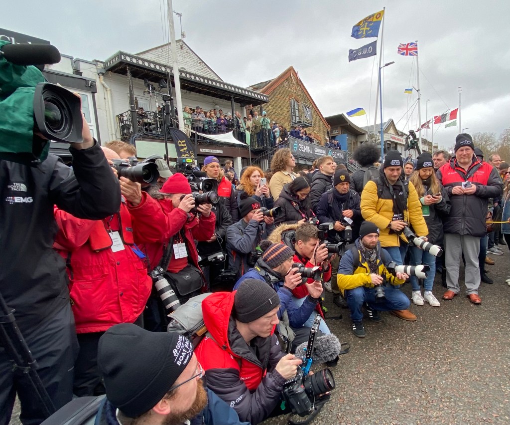 Both races were crackers. The Light Blue women were pursuing their sixth consecutive win, and no doubt had a bit of a shock when Oxford took the lead and were about two seats ahead on Middlesex at Fulham football ground. But Cambridge gradually closed the gap when they reached the Mile Post and went ahead, passing Hammersmith bridge in 8.11 minutes, but not before aggressively steering into Oxford’s water near Harrods. The Dark Blues came very close, and closeup on the screen, to a bump as the Light Blues’ Cox James Trotman washed them down, and umpire Smith was no doubt dreading an Oxford touch as he got busy with his semaphore.