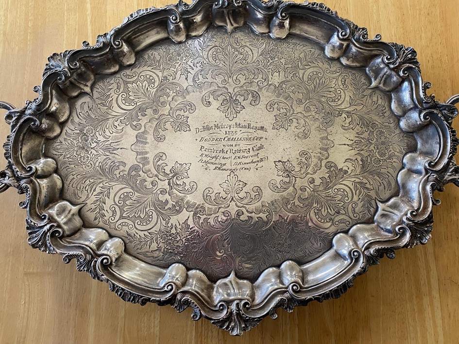 The silver tray inherited by Jane Schofield-Almond from her grandmother was the presentation prize received by Edward Wright for winning the Dodder Challenge Cup at Dublin Metropolitan Regatta on 18 July 1888. The previous year, the prizes were silver goblets; the declared value of the five trophies presented to the crew and coxswain both years were valued at £15. In purchasing power, that is equivalent to about £2,500 today or £500 per tray.