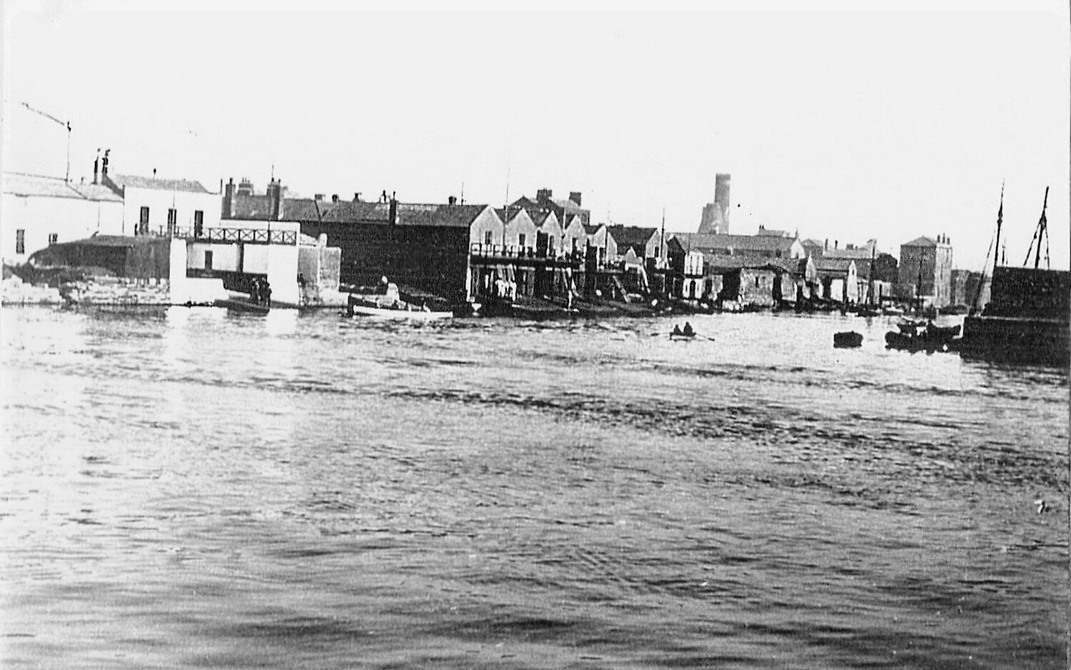 The meeting of the waters around the end of the nineteenth century. The mouth of the River Dodder, viewed from the River Liffey. On the left are the boathouses of Ringsend rowing clubs. Look carefully and you will see several rowers kitted out and ready for training. At the time that Edward Wright boated from here, the clubs racing at Metropolitan Regatta included: Commercial Rowing Club, Dolphin Rowing Club, Neptune Rowing Club, Pembroke Rowing Club, University Boat Club, and University Rowing Club.