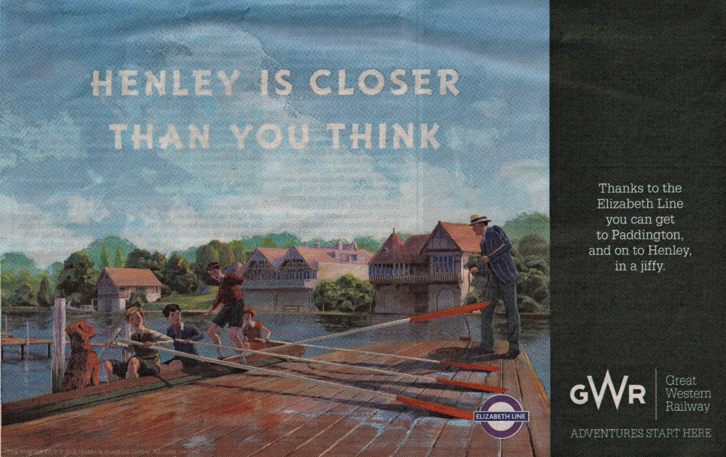 While GWR’s artwork may be peculiar, their text is correct, Henley really is closer than you think – there are less than ten weeks to go before Henley Royal Regatta 2023. If you are planning to attend, it is likely that you will be arriving by train. The branch line, single track since 1962, starts at Twyford, which is on the main line running from London to Reading, and runs for 7 km to Henley via Wargrave and Shiplake.