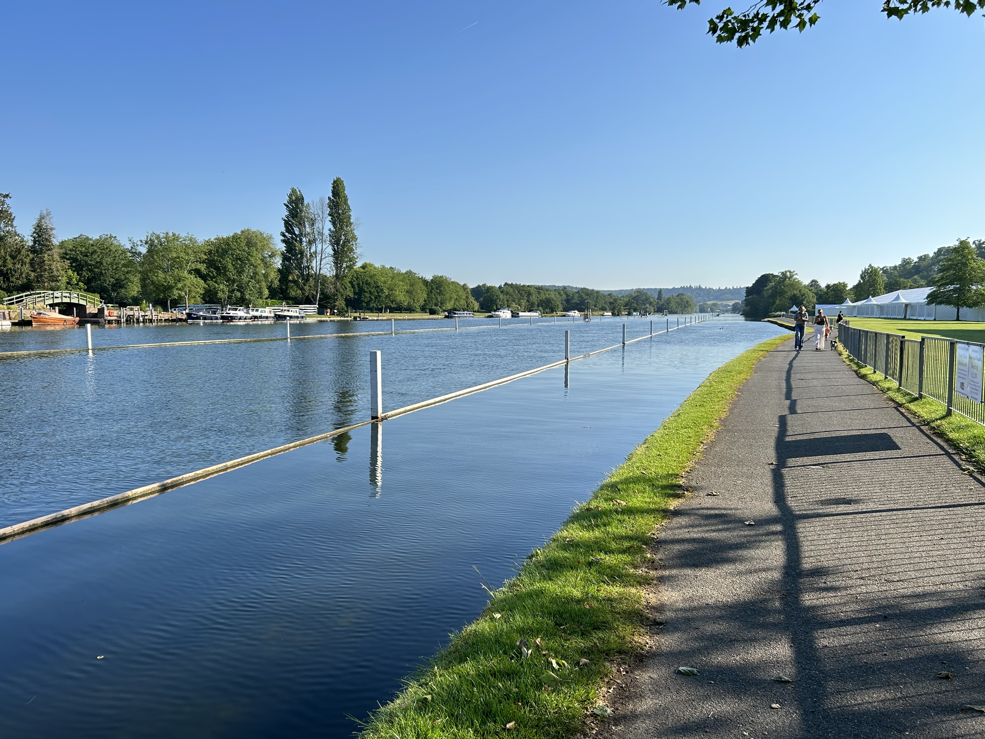 A morning stroll along the river reveals the task of booming the course is complete. The Henley Regatta caterpillar has grown to full size, but now must enter its cocoon before it can emerge in all its glory.