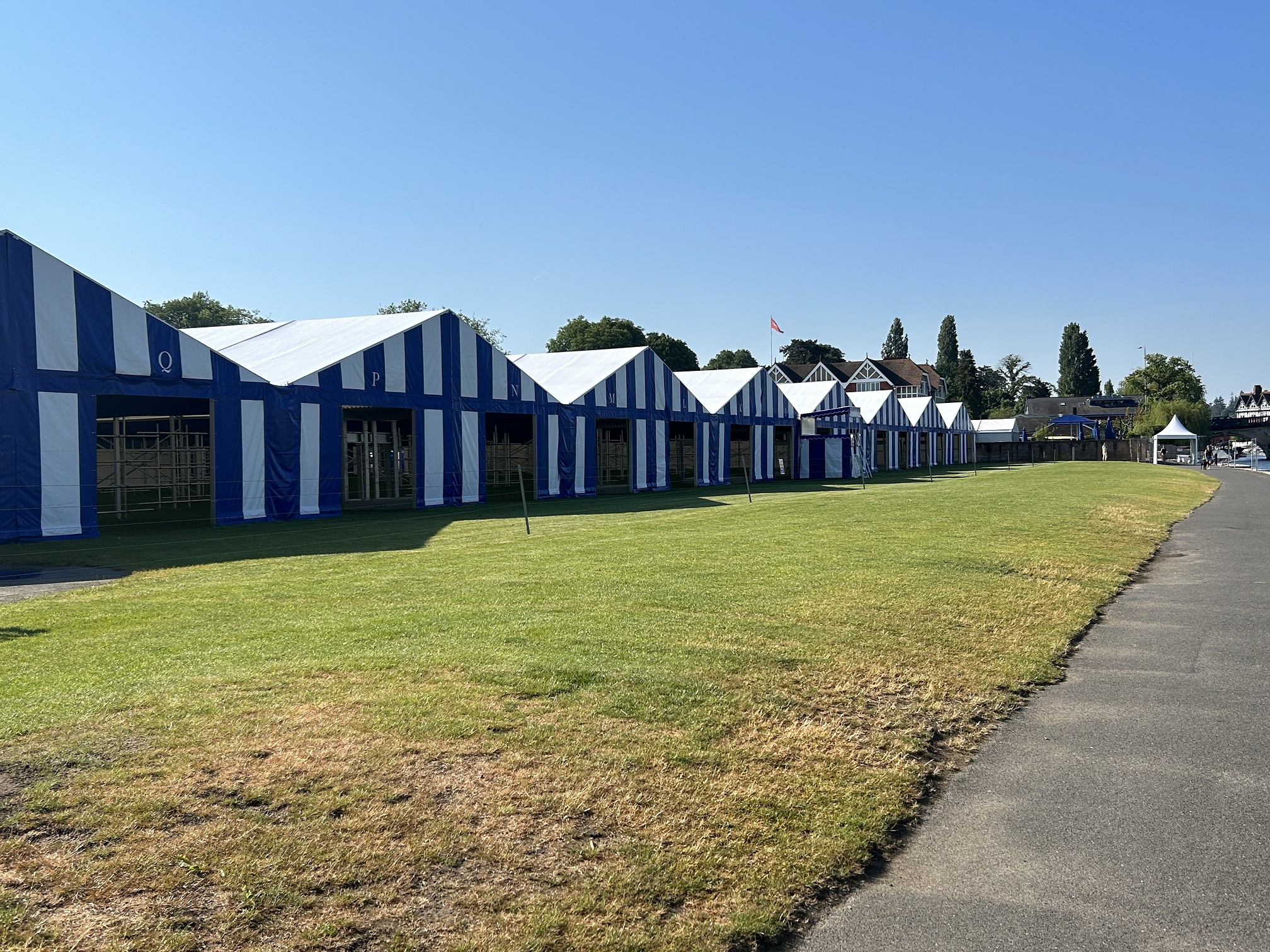Within that cocoon, a small army of tradesmen is at work to ensure the Regatta can spread its wings in a fortnight from now. The blue and white striped boat tents have returned to their traditional location between Leander and the Stewards Enclosure.