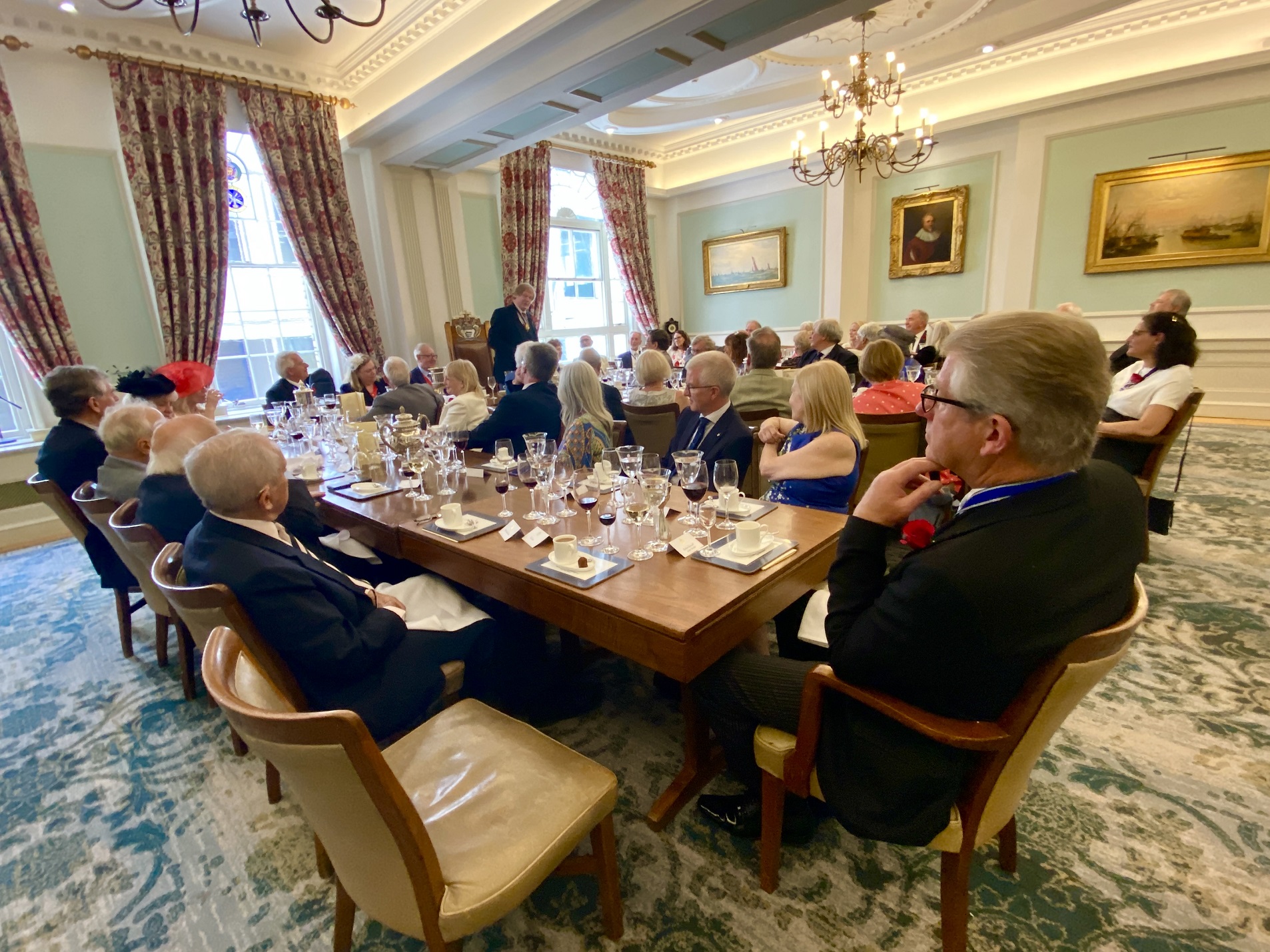 The current Master of the Watermen’s Company, Sir David Wootton, plucks a single rose to take to Mansion House and present to the Lord Mayor in annual payment of the fine imposed upon Sir Robert and Lady Knollys 642 years before.The procession (plus rose) moves from the Seething Lane Gardens towards Mansion House.Acting verger, David Risley, carries the Knollys Rose for 2023.The arrival at Mansion House, built primarily in the 1740s in the Palladian Style.The current and 694th Lord Mayor of the City of London, Nicholas Lyons, was unable to attend as he was at the funeral of Sir David Brewer, the Lord Mayor 2005 – 2006. Lyons’ place was taken by his immediate predecessor, Vincent Keaveny, shown here with his back to the camera.In Mansion House’s magnificent ballroom, Sir David Wootton, Master of the Watermen’s Company, prepares to give the Knollys Rose to the Lord Mayor’s representative.Sir David Wootton presents the rose to Alderman Vincent Keaveny. Alderman Vincent Keaveny graciously accepts the rose from Sir David Wootton (himself a City Alderman who was Lord Mayor 2011 – 2012) and expressed the hope that it was not too distressing for Sir David, a son of the White Rose County of Yorkshire, to be associated with a red rose, the symbol of Yorkshire’s enemy in the Wars of the Roses, Lancashire.The presentation of the Knollys Rose in 1954. Sir Noel Bowater (left), Lord Mayor, accepts the rose from Captain Sir Gerald Curteis, Deputy Master of Trinity House. The clergyman in the background is Tubby Clayton, the vicar of All Hallows who revived the custom in the early 1920s.The presentation of 1963. In the background on the left is Tom Phelps, then Barge Master of the Watermen’s Company.After the ceremony in Mansion House was finished, it was onto Watermen’s Hall on St Mary at Hill, EC3.A convivial lunch was served in the Hall’s Freemen’s Room with The Master in The Chair.My thanks to my host, Kensington RC/Auriol Kensington RC stalwart, Jimmy Pigden, a man who has been actively rowing for nearly 70 years. We are pictured in front of the Company’s arms displayed above the fireplace in the Court Room of Watermen’s Hall.