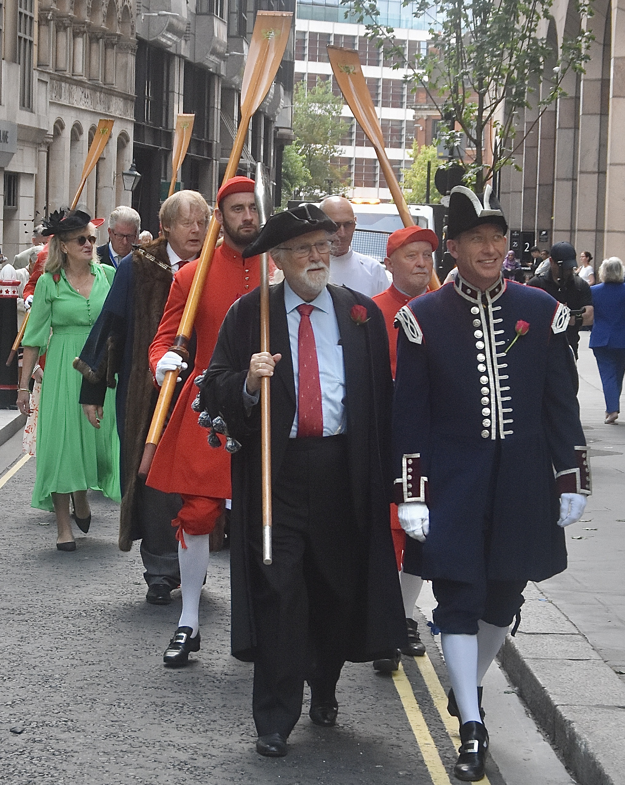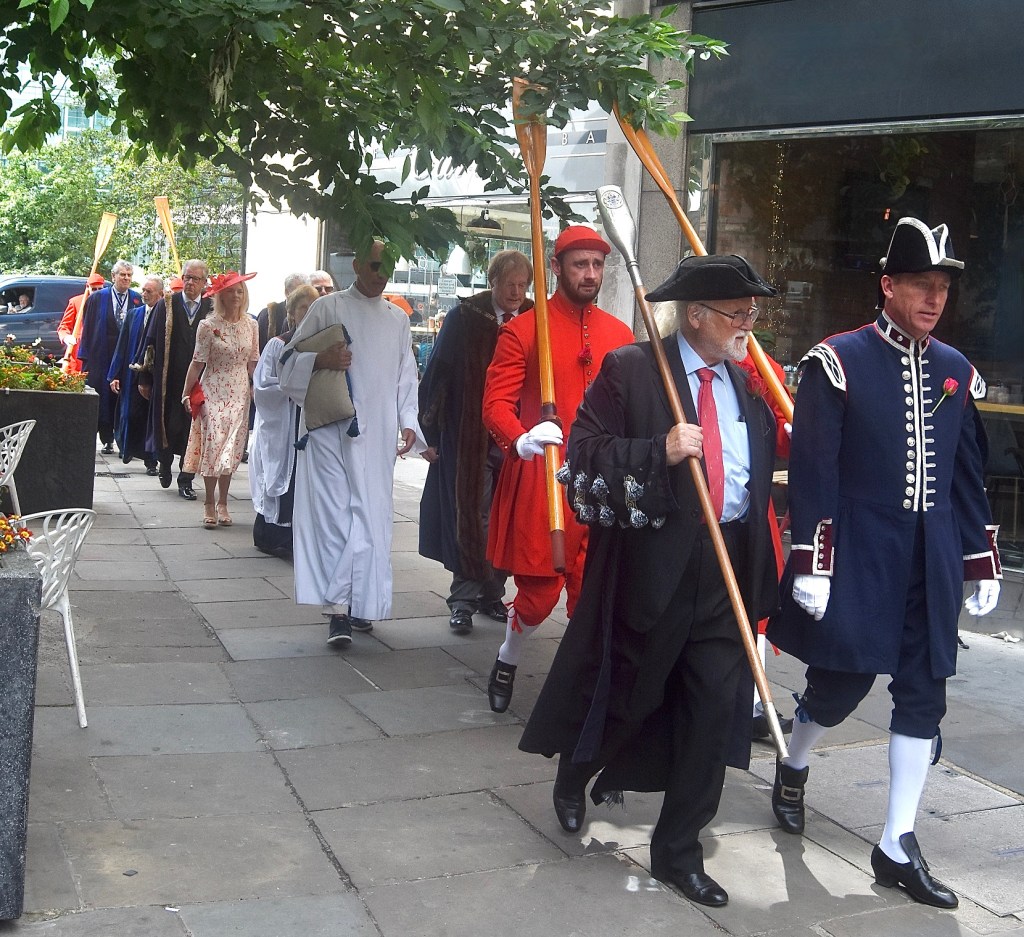 Leaving All Hallows. Our two-by-two line of people, containing a mixture of archaic dress, morning dress and lounge suits, bemused local workers (who are used to this sort of thing) but which both confused and delighted passing tourists.At the head of the procession was Robbie Coleman, Barge Master of the Watermen’s Company (right) and the Watermen’s Company Beadle, Tony Parker (left). Behind them were two Doggett’s winners. Following on was the Master of the Watermen’s Company, Sir David Wootton (right) and David Risley, an altar server at All Hallows Church. Behind the two Davids was, partly obscured here, the Reverend Sophia Acland, Associate Vicar of All Hallows. Following on and mostly out of view here were various Watermen’s Company officers, members and guests.