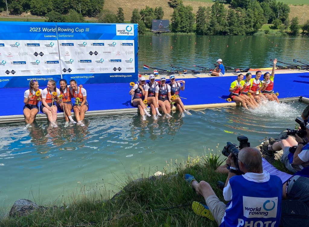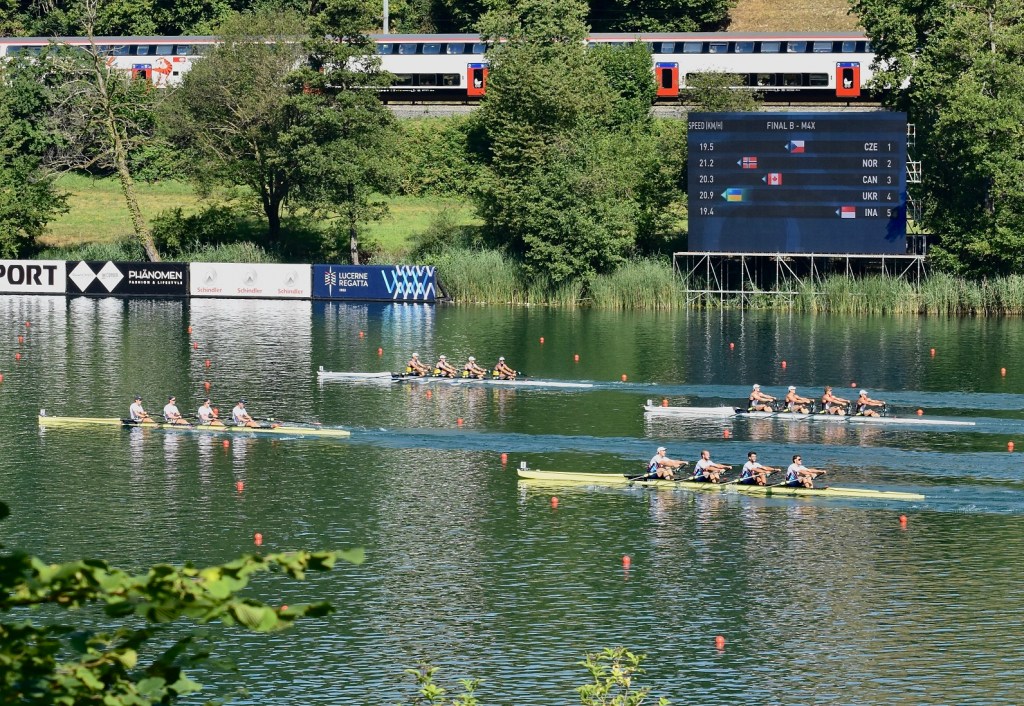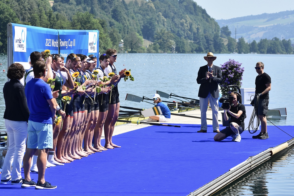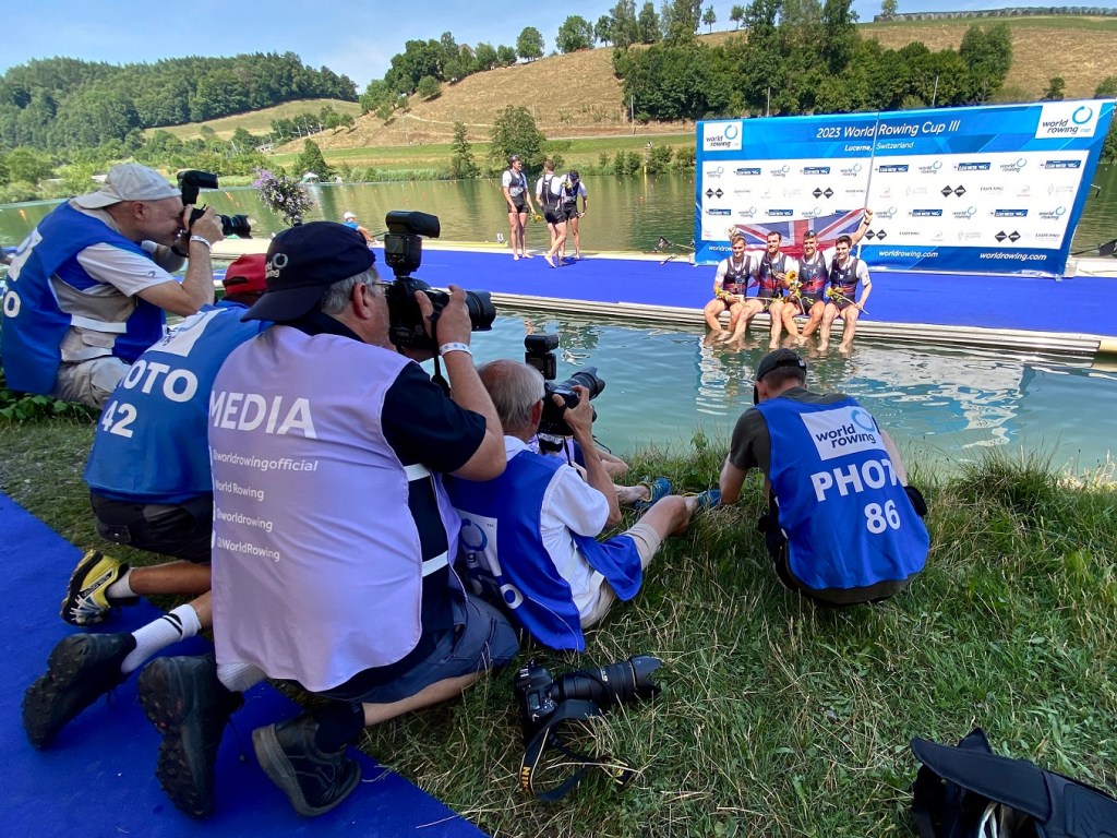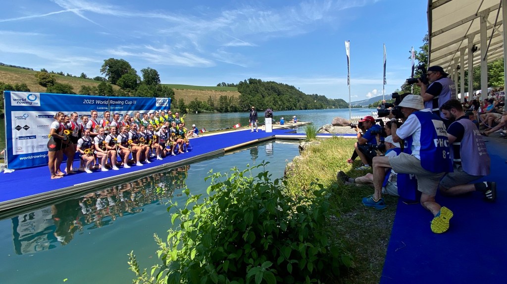 Some of the finalists in the women’s singles recover their breath. From top to bottom: Emma Twigg, Karolien Florijn, Tara Rigney and Germany’s Alexandra Föster.Rigney and Twigg hoist Florijn high.The men’s eights final at 1,750 metres. The finish times were Australia 5.23.92, Britain 5.24.53 and Netherlands 5.25.37. The British eight had been undefeated up until now but it could be argued that a loss at this stage, with the Olympics only a year away, may discourage any complacency in the GB crew. It should get interesting when the two next meet in some sort of Aquatic Ashes at the World Championships in September.“What’s that Skip? We’ve beaten the Poms to win Men’s Eights!” For the benefit of those who missed the 1970s kids TV show, Skippy the Bush Kangaroo, the eponymous marsupial spent a lot of time communicating to adults that yet another child had fallen down a mineshaft.In the Men’s Four. Britain was first followed by Australia and then New Zealand. The GB crew has been undefeated this year and naturally would like to reclaim the Olympic Fours title that British crews had won at Olympic Regatta from 2000 until GB rowing’s disastrous Tokyo Games in 2021.The Men’s Four medal ceremony. Britain was the first country to win five consecutive Olympic titles in the M4-, breaking the record managed by East Germany between 1968 and 1980, and by Britain themselves between 1908 and 1932 (the Olympic Regattas of 1912 and 1920 did not have coxless four events). A photographer’s view of the Men’s Four celebrations.Media time for the second placed GB Women’s Quad.In the Women’s Quad Sculls, four of the crews in the A-Final came through the repechage: Ukraine, Germany, Britain and Switzerland, the latter two coming second and third respectively behind the Netherlands who had led from the start. Unbeaten since 2019, the Chinese Olympic combination was fourth. The Dutch double of Melvin Twellaar and Stef Broenink won the Men’s Double Sculls. The fight for first place was between them and the Sinkovic brothers, but the Croatians had to settle for second. There was an enormous battle for third, but the splendid Irish combination of Philip Doyle and Daire Lynch prevailed.Stef Broenink and Melvin Twellaar are seen here reviewing a recording of their race.Martin and Valent Sinković accepted second place with their customary good grace despite perhaps not having sculled their best. Here they are photobombed by Dominik Keller.Not to take anything away from him but Olli Zeidler’s win in the men’s single was perhaps the least surprising result of the regatta. The German champion won at World Cups I and II and at III was nearly eight-seconds ahead of second placed Sverri Nielsen of Denmark. Thomas Mackintosh of New Zealand was third and Ryuta Arakawa, Japan’s first ever men’s single sculler to make an A-Final, was fourth.Zeidler triumphant.In the words of Rachel Quarrell, “British lightweight women’s double Emily Craig and Imogen Grant (have) an aura of invincibility but still go at every race as if it’s their last…” They won Lightweight Women’s Double Sculls by over four seconds.The Australian Women’s Pair of Jess Morrison and Annabelle Mcintyre finished over 5 seconds up on Romania and over 11-seconds up on Greece.Tom George and Ollie Wynne-Griffith celebrate after winning a dramatic Men’s Pairs race. They had lost their lead to the Romanians in the last 500 metres but got back in front just as the finish line approached.It was Britain, Canada and then Australia in the Women’s Eights. Canada had beaten GB at Henley a week earlier, but both went past Australia in the final very exciting one hundred metres.Hugs at the finish between two of the victorious GB Women’s Eight.The medal ceremony for the women’s eights.Henry Fieldman, cox of the GB Women’s Eight, reviews the final race with some of his crew.Before the A-Finals, Sunday morning saw most of the B-Finals take place. The Men’s 4x B-Final saw a popular win for Ukraine who had the wonderfully named Bull Hula at “2”. After three stages spanning early May to early July, Great Britain topped the World Cup Medal Table with 115 points, followed by Australia in second with 103, and Switzerland in third with 95. Here, Louise Kingsley, Director of Performance for the GB Rowing Team, holds the trophy. More details on the World Rowing site.Next stop, the World Championships, 3-10 September in Belgrade, Serbia. This will be the first opportunity to qualify for the Paris 2024.The Lucerne Regatta mascot says “Auf wiedersehen”. Anyone who returns for the 2024 World Cup II could meet her again and possibly get a sense of déjà moo.