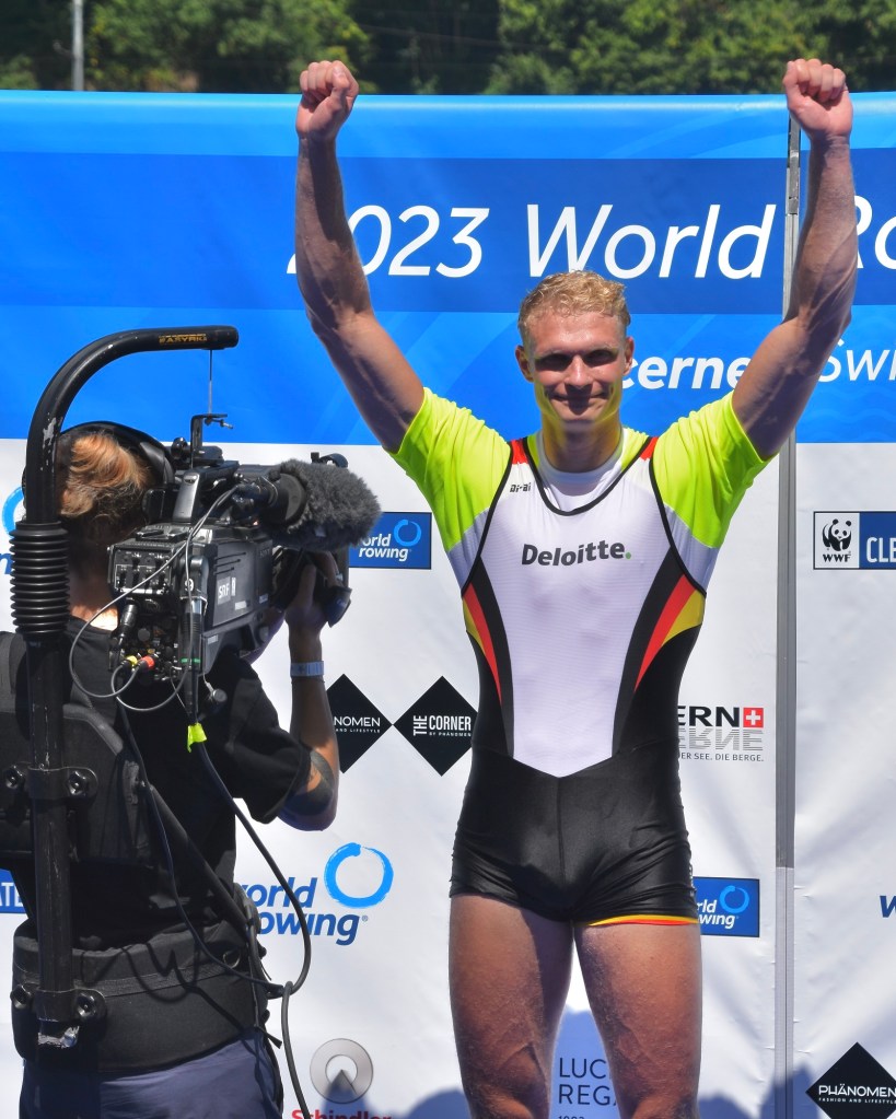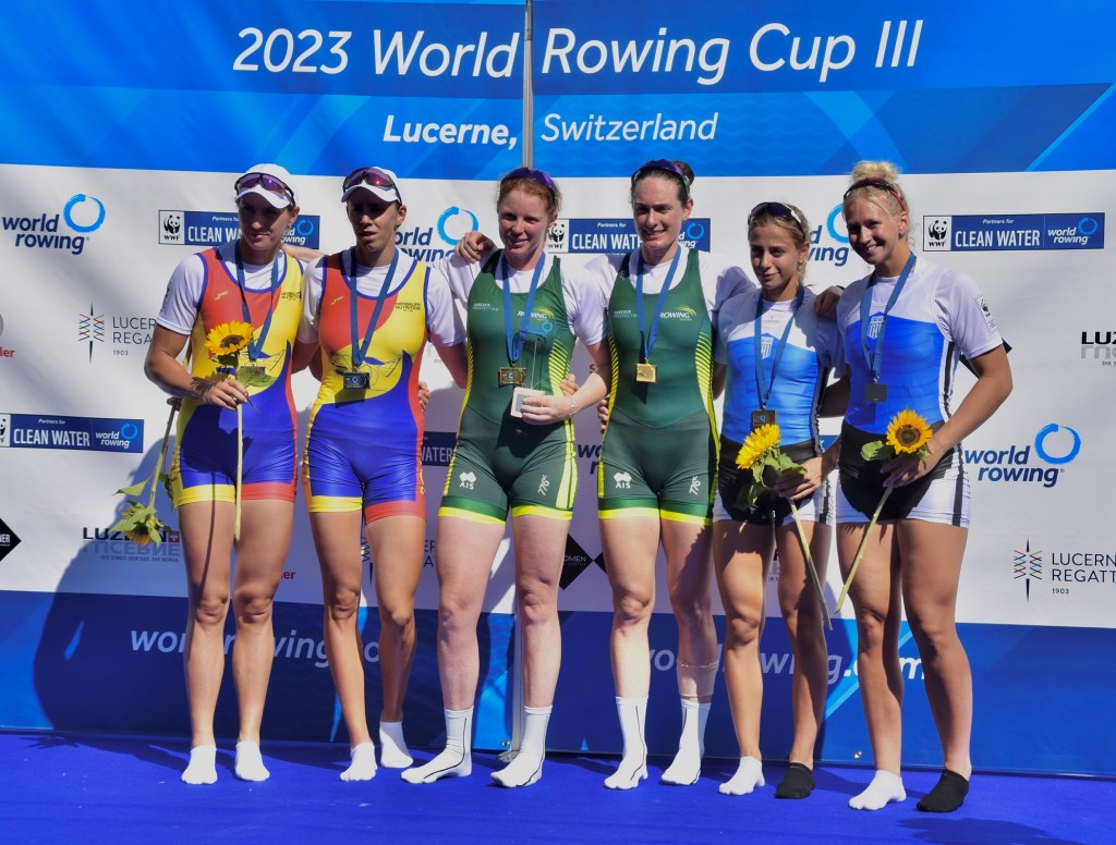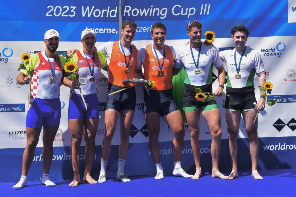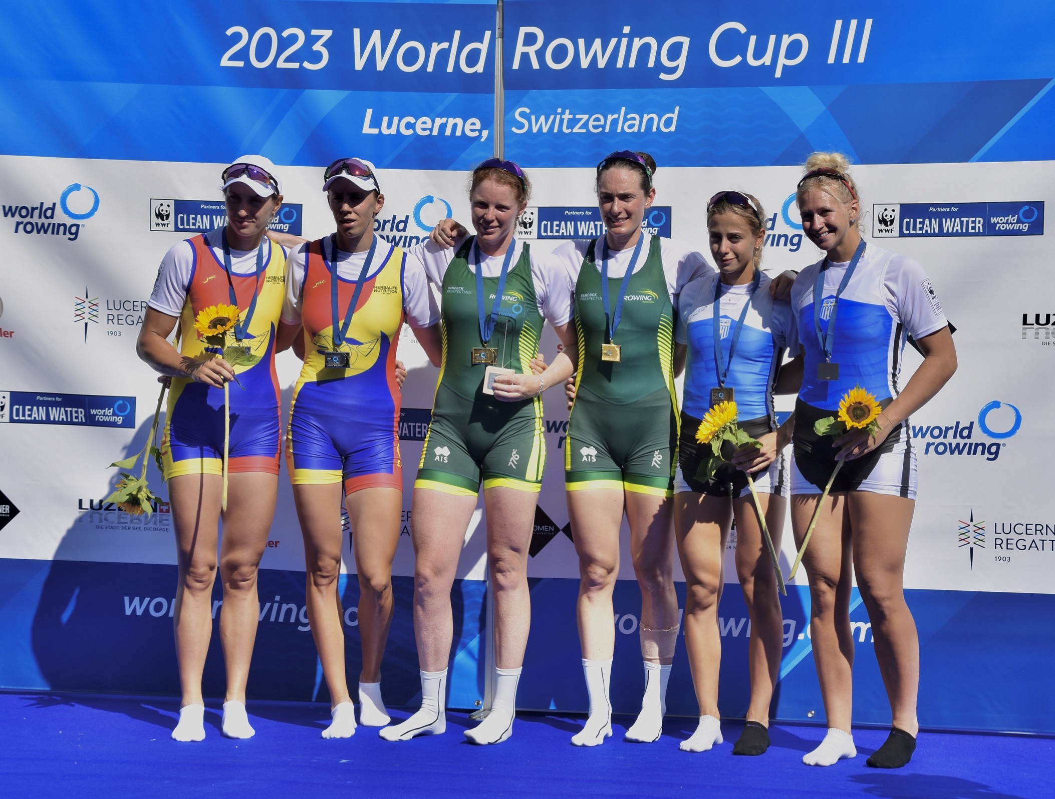 Some of the finalists in the women’s singles recover their breath. From top to bottom: Emma Twigg, Karolien Florijn, Tara Rigney and Germany’s Alexandra Föster.Rigney and Twigg hoist Florijn high.The men’s eights final at 1,750 metres. The finish times were Australia 5.23.92, Britain 5.24.53 and Netherlands 5.25.37. The British eight had been undefeated up until now but it could be argued that a loss at this stage, with the Olympics only a year away, may discourage any complacency in the GB crew. It should get interesting when the two next meet in some sort of Aquatic Ashes at the World Championships in September.“What’s that Skip? We’ve beaten the Poms to win Men’s Eights!” For the benefit of those who missed the 1970s kids TV show, Skippy the Bush Kangaroo, the eponymous marsupial spent a lot of time communicating to adults that yet another child had fallen down a mineshaft.In the Men’s Four. Britain was first followed by Australia and then New Zealand. The GB crew has been undefeated this year and naturally would like to reclaim the Olympic Fours title that British crews had won at Olympic Regatta from 2000 until GB rowing’s disastrous Tokyo Games in 2021.The Men’s Four medal ceremony. Britain was the first country to win five consecutive Olympic titles in the M4-, breaking the record managed by East Germany between 1968 and 1980, and by Britain themselves between 1908 and 1932 (the Olympic Regattas of 1912 and 1920 did not have coxless four events). A photographer’s view of the Men’s Four celebrations.Media time for the second placed GB Women’s Quad.In the Women’s Quad Sculls, four of the crews in the A-Final came through the repechage: Ukraine, Germany, Britain and Switzerland, the latter two coming second and third respectively behind the Netherlands who had led from the start. Unbeaten since 2019, the Chinese Olympic combination was fourth. The Dutch double of Melvin Twellaar and Stef Broenink won the Men’s Double Sculls. The fight for first place was between them and the Sinkovic brothers, but the Croatians had to settle for second. There was an enormous battle for third, but the splendid Irish combination of Philip Doyle and Daire Lynch prevailed.Stef Broenink and Melvin Twellaar are seen here reviewing a recording of their race.Martin and Valent Sinković accepted second place with their customary good grace despite perhaps not having sculled their best. Here they are photobombed by Dominik Keller.Not to take anything away from him but Olli Zeidler’s win in the men’s single was perhaps the least surprising result of the regatta. The German champion won at World Cups I and II and at III was nearly eight-seconds ahead of second placed Sverri Nielsen of Denmark. Thomas Mackintosh of New Zealand was third and Ryuta Arakawa, Japan’s first ever men’s single sculler to make an A-Final, was fourth.Zeidler triumphant.In the words of Rachel Quarrell, “British lightweight women’s double Emily Craig and Imogen Grant (have) an aura of invincibility but still go at every race as if it’s their last…” They won Lightweight Women’s Double Sculls by over four seconds.The Australian Women’s Pair of Jess Morrison and Annabelle Mcintyre finished over 5 seconds up on Romania and over 11-seconds up on Greece.Tom George and Ollie Wynne-Griffith celebrate after winning a dramatic Men’s Pairs race. They had lost their lead to the Romanians in the last 500 metres but got back in front just as the finish line approached.It was Britain, Canada and then Australia in the Women’s Eights. Canada had beaten GB at Henley a week earlier, but both went past Australia in the final very exciting one hundred metres.Hugs at the finish between two of the victorious GB Women’s Eight.The medal ceremony for the women’s eights.Henry Fieldman, cox of the GB Women’s Eight, reviews the final race with some of his crew.Before the A-Finals, Sunday morning saw most of the B-Finals take place. The Men’s 4x B-Final saw a popular win for Ukraine who had the wonderfully named Bull Hula at “2”. After three stages spanning early May to early July, Great Britain topped the World Cup Medal Table with 115 points, followed by Australia in second with 103, and Switzerland in third with 95. Here, Louise Kingsley, Director of Performance for the GB Rowing Team, holds the trophy. More details on the World Rowing site.Next stop, the World Championships, 3-10 September in Belgrade, Serbia. This will be the first opportunity to qualify for the Paris 2024.The Lucerne Regatta mascot says “Auf wiedersehen”. Anyone who returns for the 2024 World Cup II could meet her again and possibly get a sense of déjà moo.
