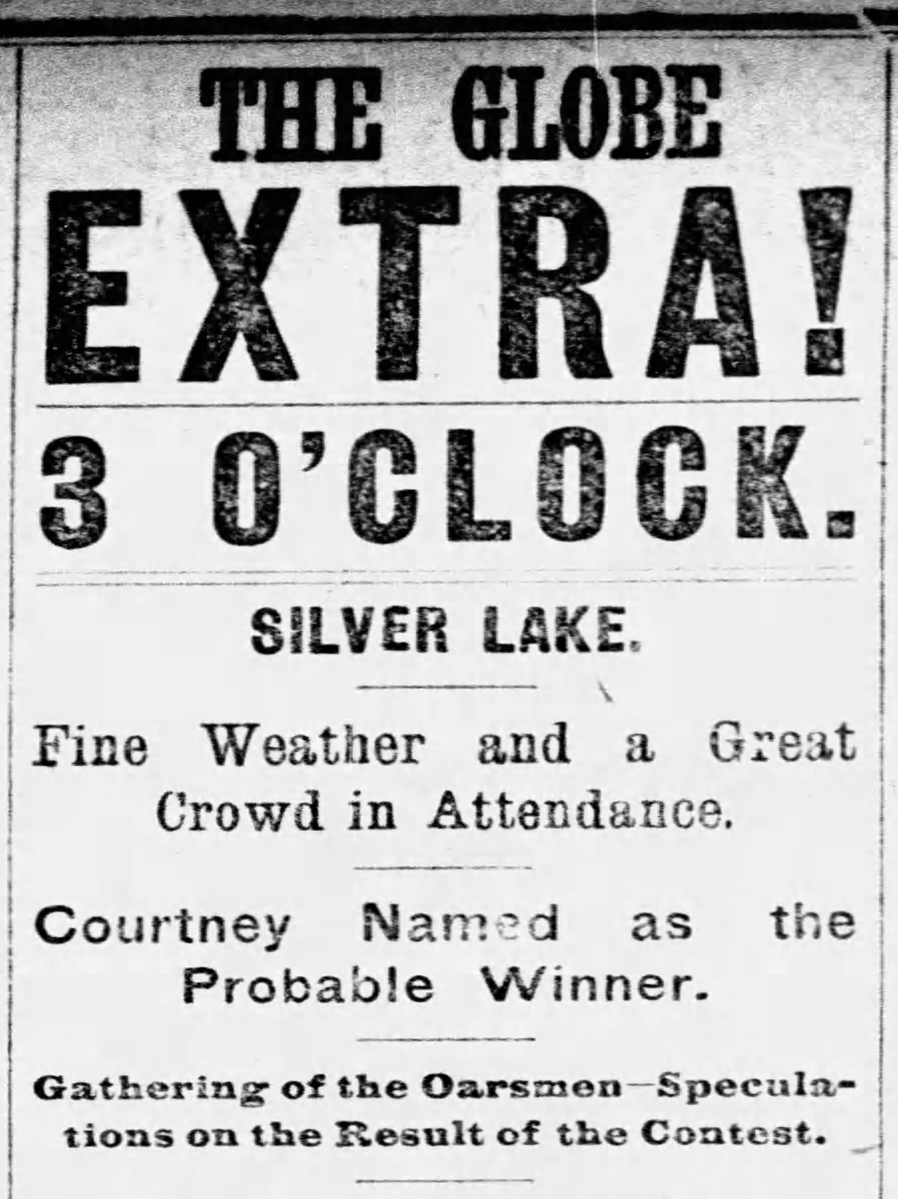 Another regatta was scheduled for August 29. Three events were scheduled, again, all for professionals: Single-Sculls, Working Single-Sculls, and Four-Oared Working Boats. Good quality scullers entered the single-sculls race but three of the top professionals, Courtney, Riley, and Plaisted, were absent and expected to race at Saratoga. The contestants were all from the Boston region. The Old Colony Railroad transferred 1,600 enthusiastic spectators to Silver Lake.