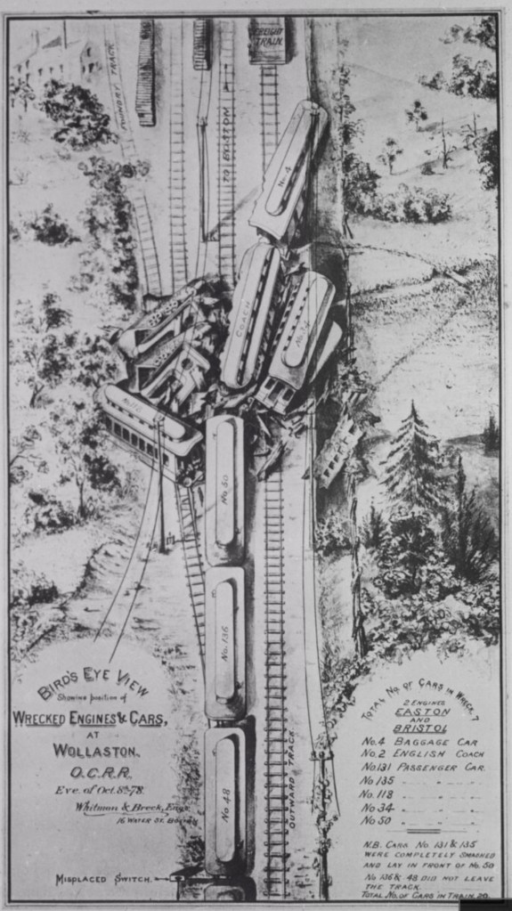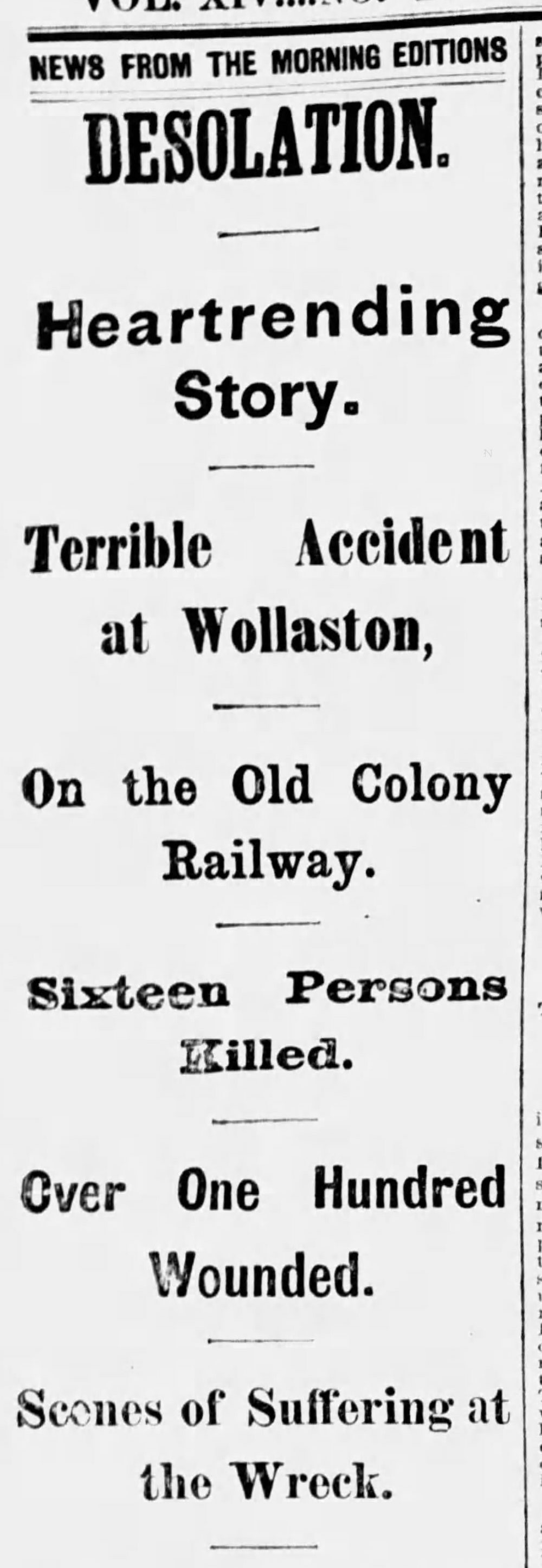 The train was passing through Wollaston, Massachusetts, about ten miles from Boston at full steam. A freight train was inadvertently switched to the travel tracks. The engineer tried to apply brakes, but it was too late.
