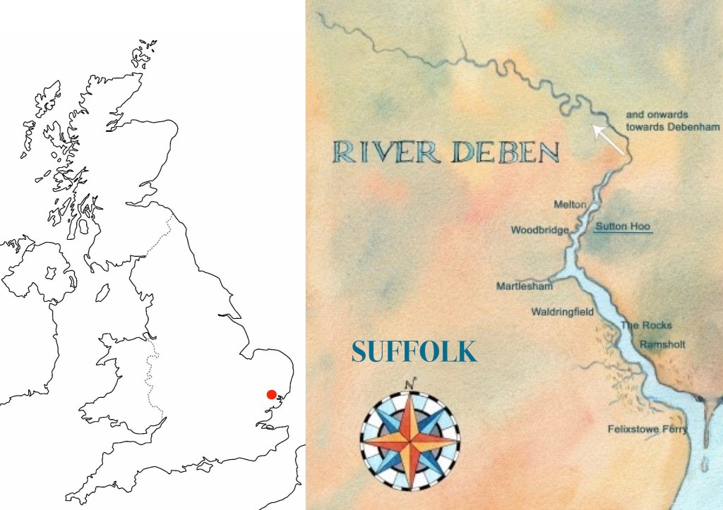The Deben’s lowest convenient fording place is above Woodbridge, seven miles (11 km) from the North Sea. There are sixth-century burial grounds to the south at Rushmere, Little Bealings and Tuddenham St Martin, and Bronze Age mounds circle Brightwell Heath. Cemeteries of a similar date are found at Rendlesham and Ufford, and a ship-burial at Snape is the only comparable one with Sutton Hoo in England.