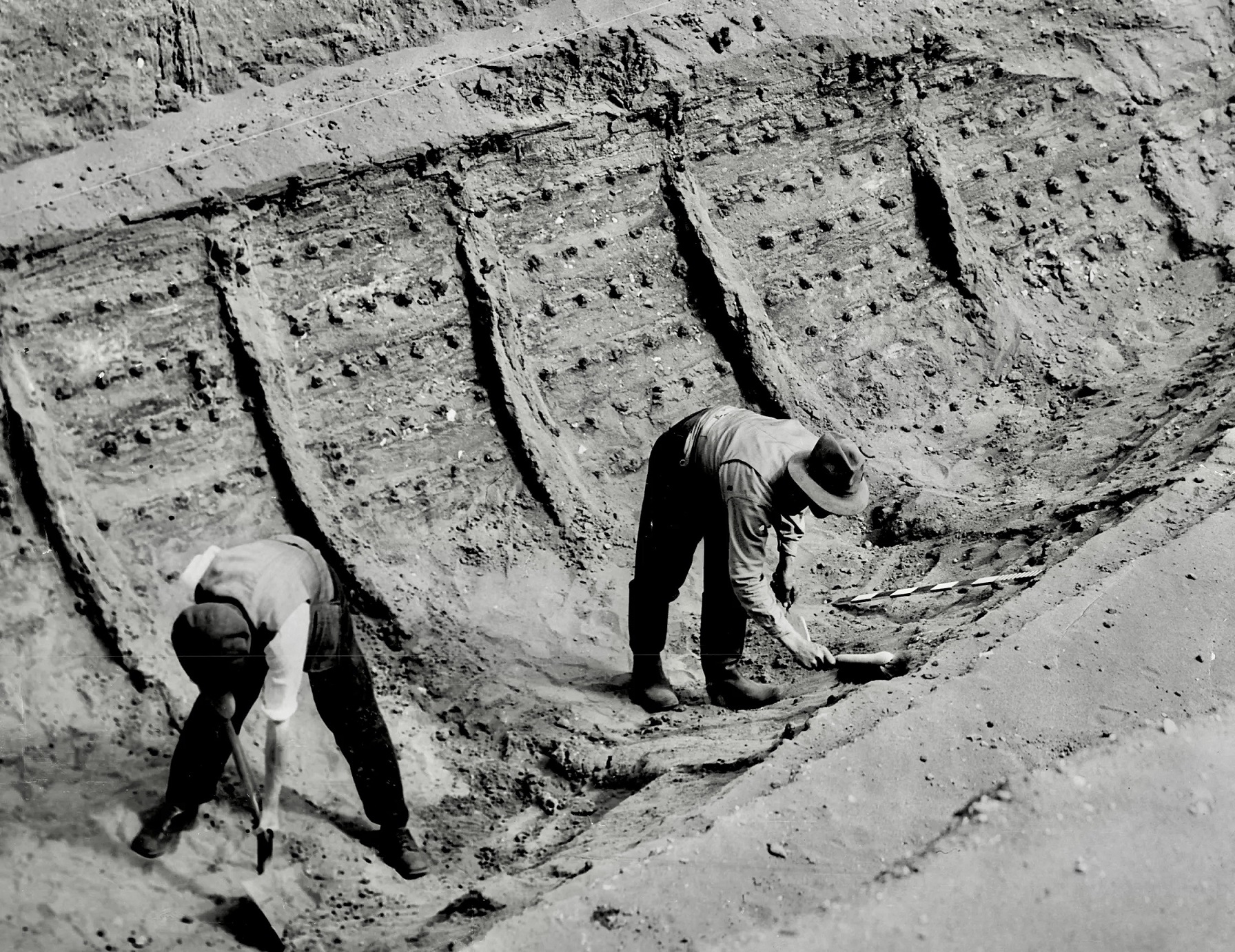 From the keel board, the hull was constructed clinker-fashion with nine planks on either side, fastened with rivets. Twenty-six wooden ribs strengthened the form. Repairs were visible: this had been a seagoing vessel of excellent craftsmanship, but there was no descending keel. The decking, benches and mast were removed. In the fore and aft sections along the gunwales, there were oar-rests shaped like the Old English letter ‘thorn’, indicating that there may have been positions for forty oarsmen. The central chamber had timber walls at both ends and a roof, which was probably pitched.