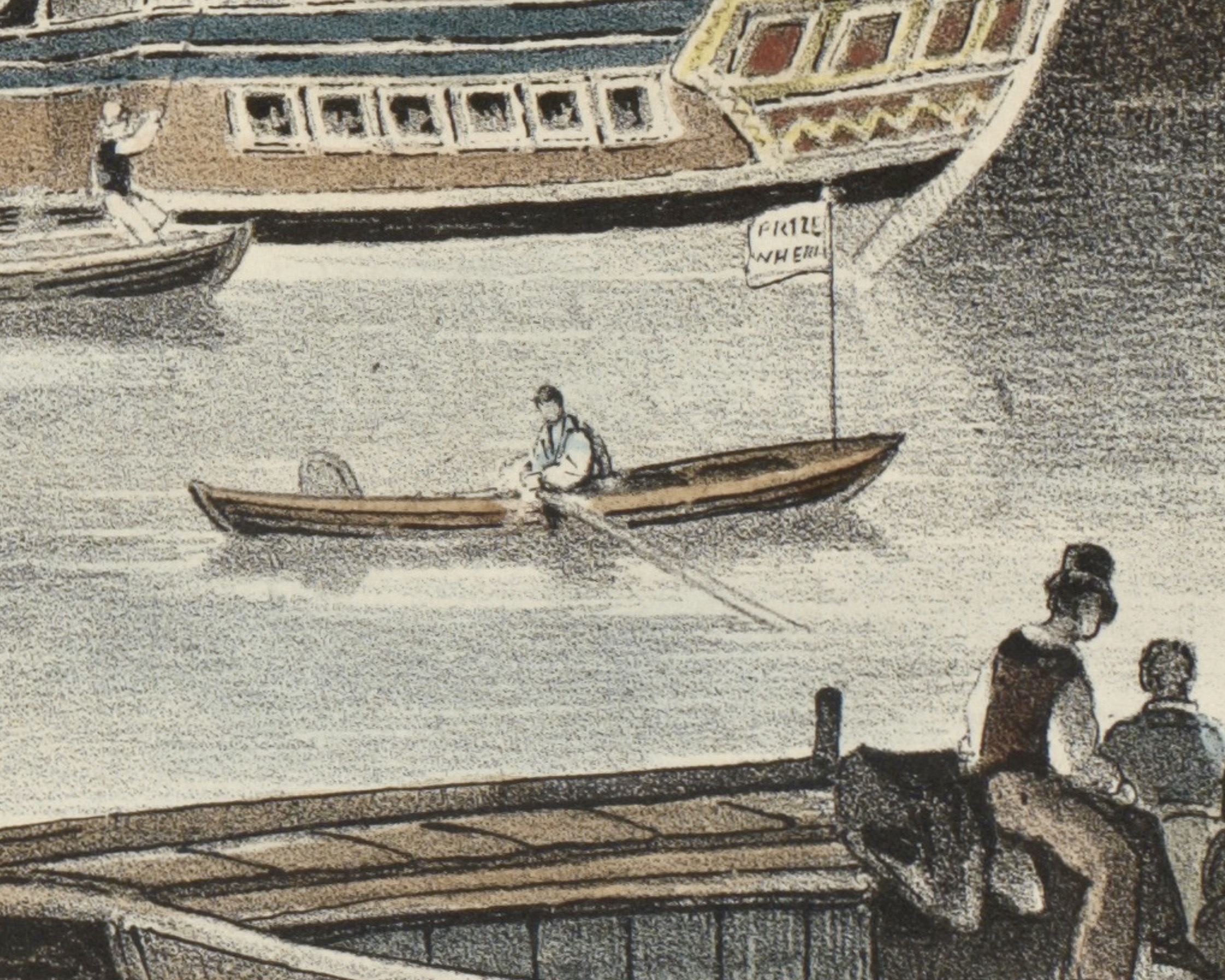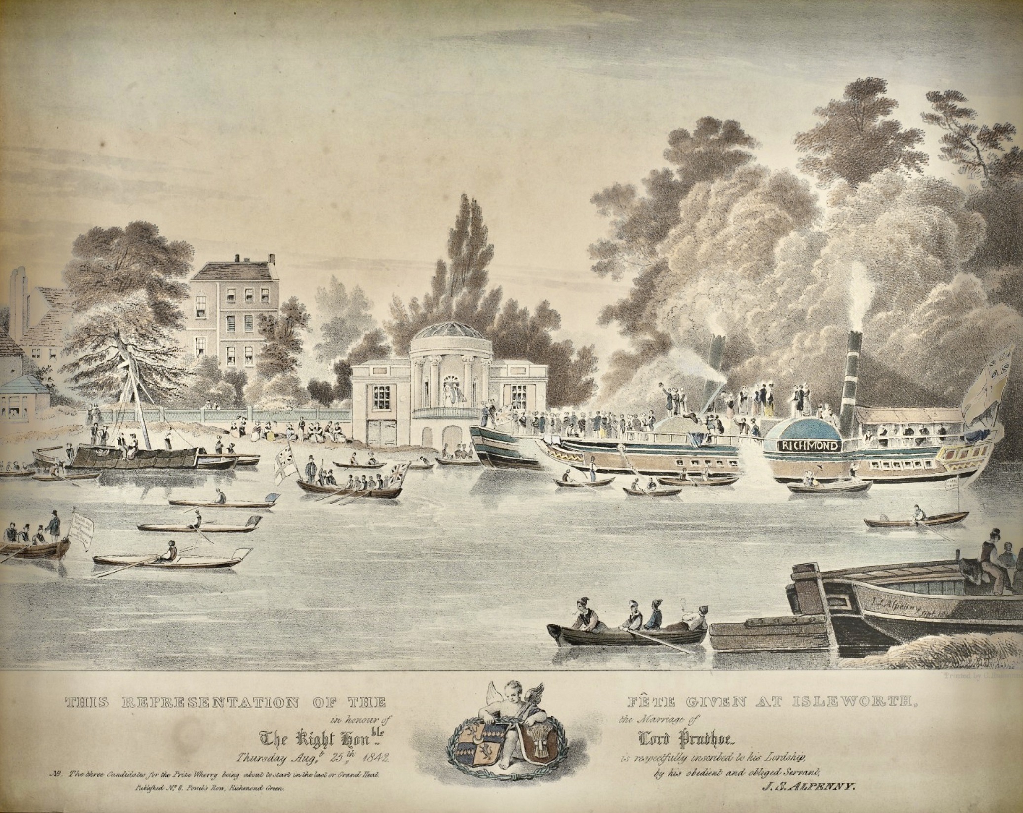 This lithograph has the inscription “This Representation of the Fête Given at Isleworth in honour of the Marriage of The Right Honourable Lord Prudhoe, Thursday, August 25th 1842, is respectfully inscribed to his Lordship by his obedient and obliged Servant J.S. Alpenny. The three Candidates for the Prize Wherry being about to start in the last or Grand Heat.”