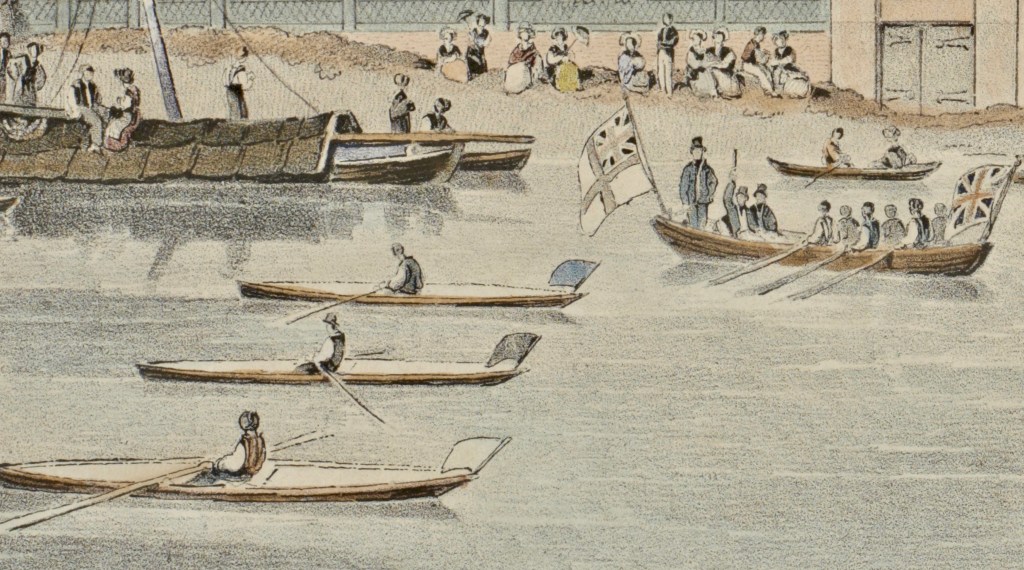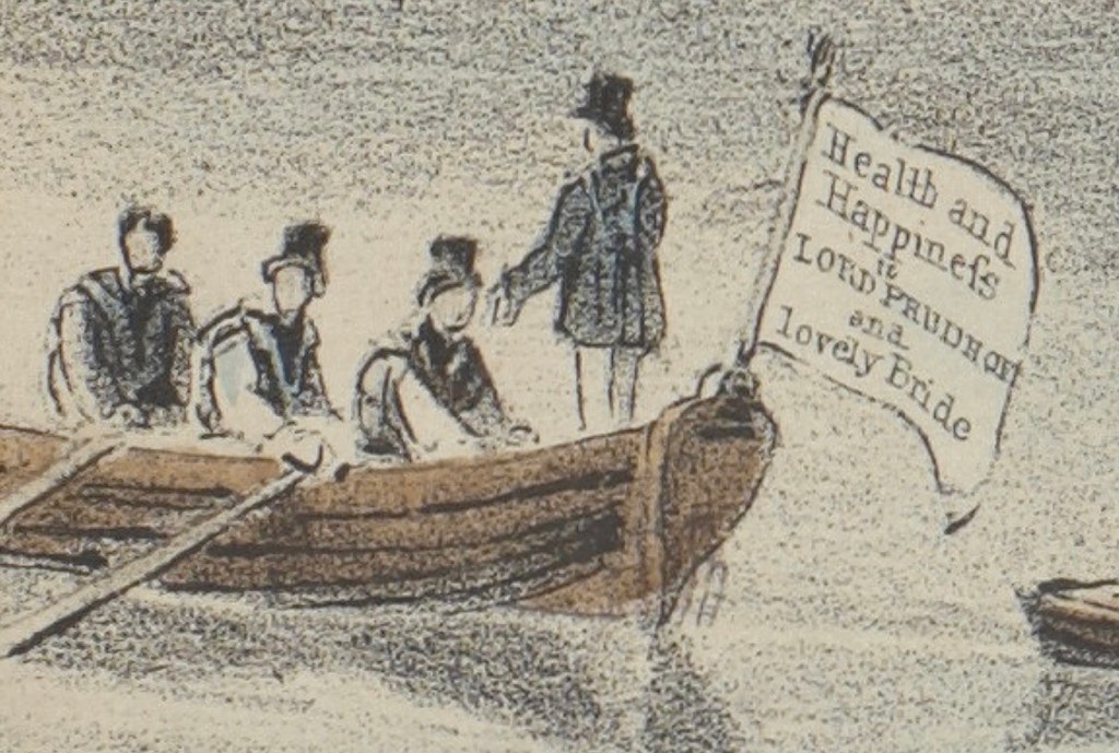 Returning to the 1842 lithograph pictured above, The Era newspaper of 28 August 1842 gives a full report of the day including the “Percy-Grosvenor Nuptials Regatta.”