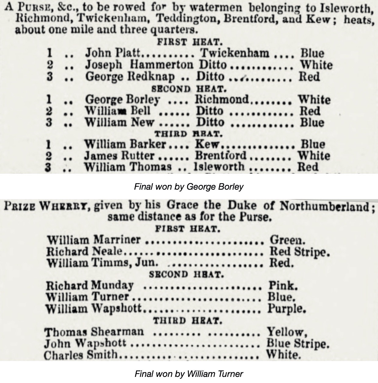 (In 1833) the King and Queen paid a second visit to watch a race for a purse of Sovereigns, given by His Grace. Nine watermen from Isleworth, Twickenham and Richmond competed…
