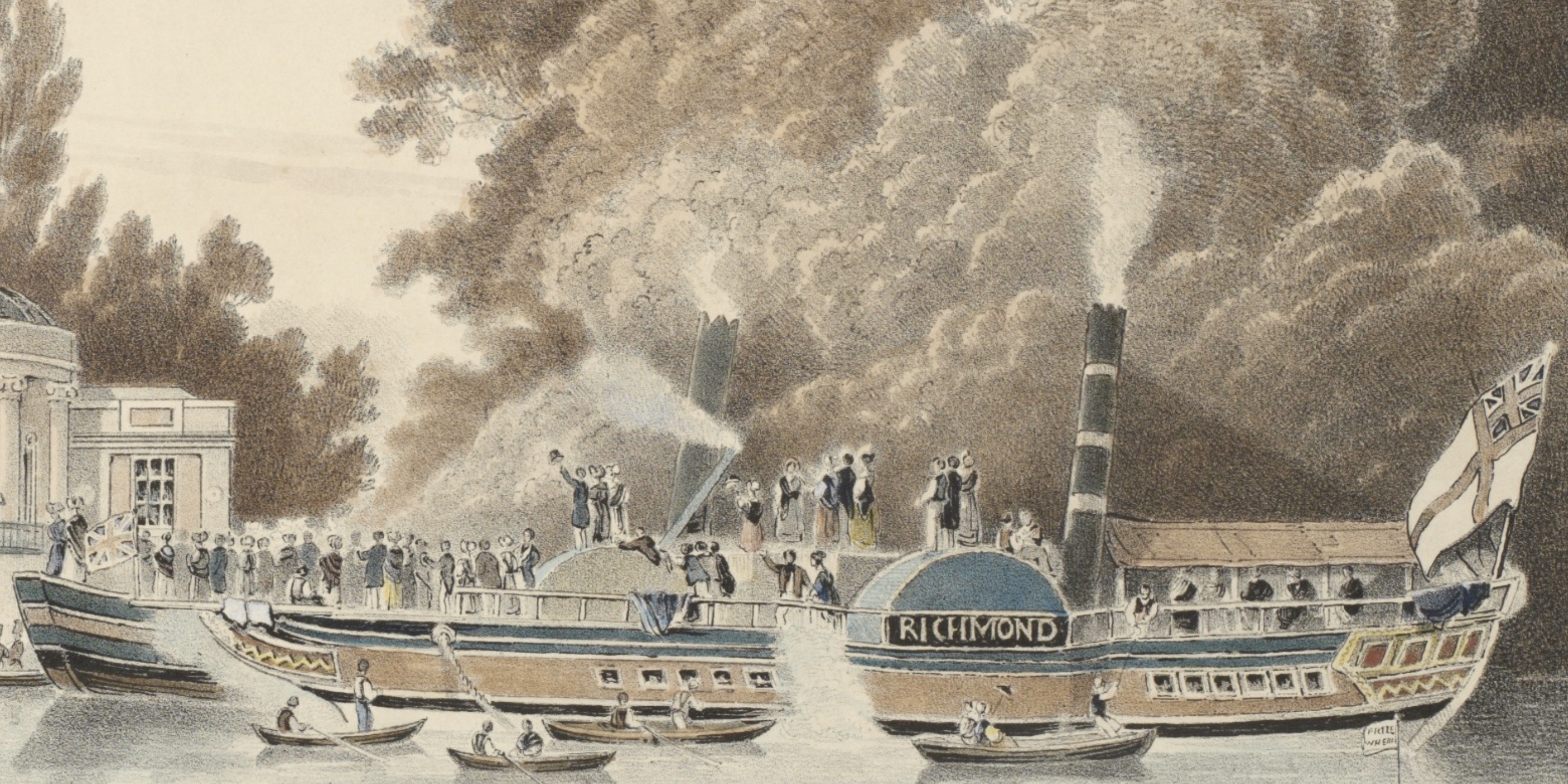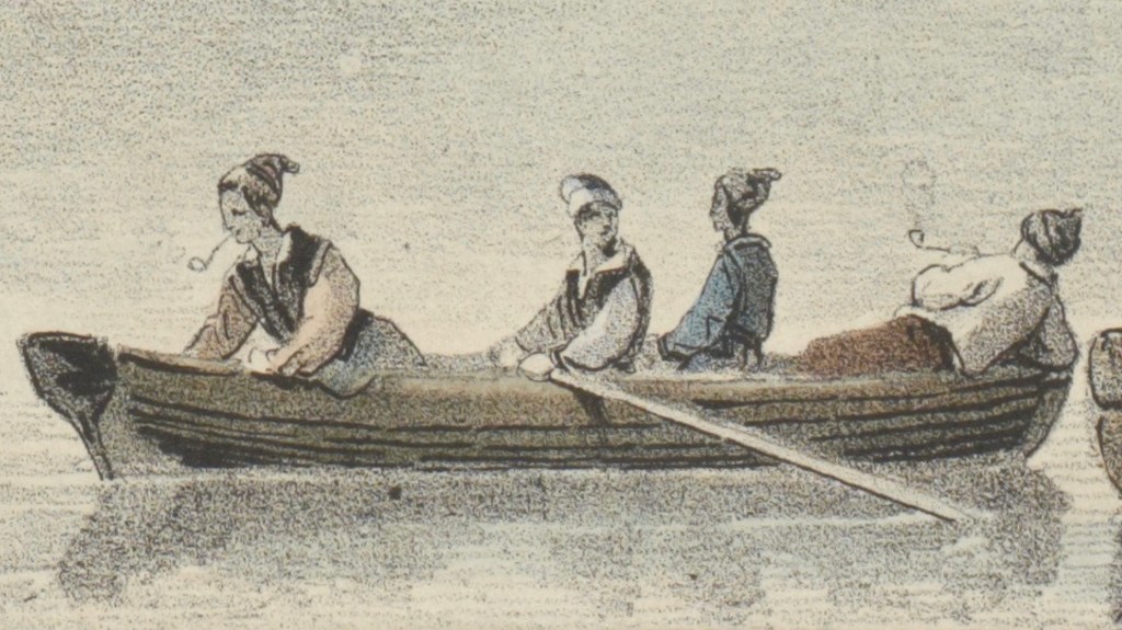 The first part of the Era’s report on the union through marriage of two great and ancient English families, Percy and Grosvenor. Lord Prudhoe was Algernon Percy, from 1847 the 4th Duke of Northumberland (1792-1865). His bride, Eleanor (1820-1911), was the daughter of Richard Grosvenor, 2nd Marquess of Westminster. The couple were actually married at St George’s, Hanover Square, Central London, but returned to Syon for the wedding festivities.Syon House by Robert Griffier (c.1675 – c.1760). The Percy Family came to Syon around 1594 – which was late for a family that arrived in England in 1067. Syon House is the last surviving ducal residence complete with its country estate in Greater London. This painting could show the “Northumberland State Barge” mentioned above (though this particular craft does not seem grand enough to merit this title).The Era noted that Lord Prudhoe’s elder brother, the 3rd Duke, gave a wherry with oars and sculls as the prize for the Isleworth watermen’s race. His Lordship himself gave prize money totalling £10 for another contest for watermen from within a three-mile radius. The banks were lined with spectators, some of whom had come from upriver on two steamers which then moored to view the races.The steamer Richmond with spectators ashore and afloat.Showing deference to the local Lord.The final of the Isleworth free watermen’s race. The blue flag is carried by William Turner, the black by William Timms Junior (though it should have been coloured red in this picture) and the white by Charles Smith. The umpire’s boat is on the right and The Era identifies the three men in the stern. The umpires for the wherry races were Horatio Day (possibly standing) and “Ashby Esq” (possibly sitting on the right with the starting pistol) They were accompanied by “Mr Styles, Queen’s Waterman” (probably sitting on the left) with the six oarsmen forming “an effective crew.”The draw for the two events, each with three heats and a final. In the race for watermen from Isleworth, Richmond, Twickenham, Teddington, Brentford and Kew, the heats were won by Platt, Barker and Borley. In the final, George Borley of Richmond won the purse of £5. In the Isleworth free watermen’s race, Timms, Smith and Turner got to the final where the wherry was won by William Turner.William Timms Junior was an unsuccessful finalist in the Isleworth watermen’s race for the wherry. Pictured here is his grandfather or great-grandfather, another William Timms, painted by Emma Soyer when he was 95 in 1838. Timms was a waterman to the 1st, 2nd and 3rd Dukes of Northumberland and, as a King’s/Queen’s Waterman, attended the coronations of George III, George IV, William IV and Victoria.Some of the visitors “amongst whom the most perfect harmony and hilarity existed” according to The Era.The Era reported that after racing had finished, the bride and groom appeared on the balcony of the Pavilion and were cheered by the crowds. The prize wherry was then brought in front of the Pavilion and the Rev Mr Glossop presented it to William Turner.Lord Prudhoe (aged 50) and the new Lady Prudhoe (aged 22) on the balcony of the Pavilion.The Percy and Grosvenor arms united. It was considered an excellent match since Lord Prudhoe’s older brother, the 3rd Duke, was childless after twenty-six years of marriage. Lord Prudhoe became the 4th Duke in 1847 but no children resulted from the Percy – Grosvenor union.The prize wherry, The Lady Elenor.