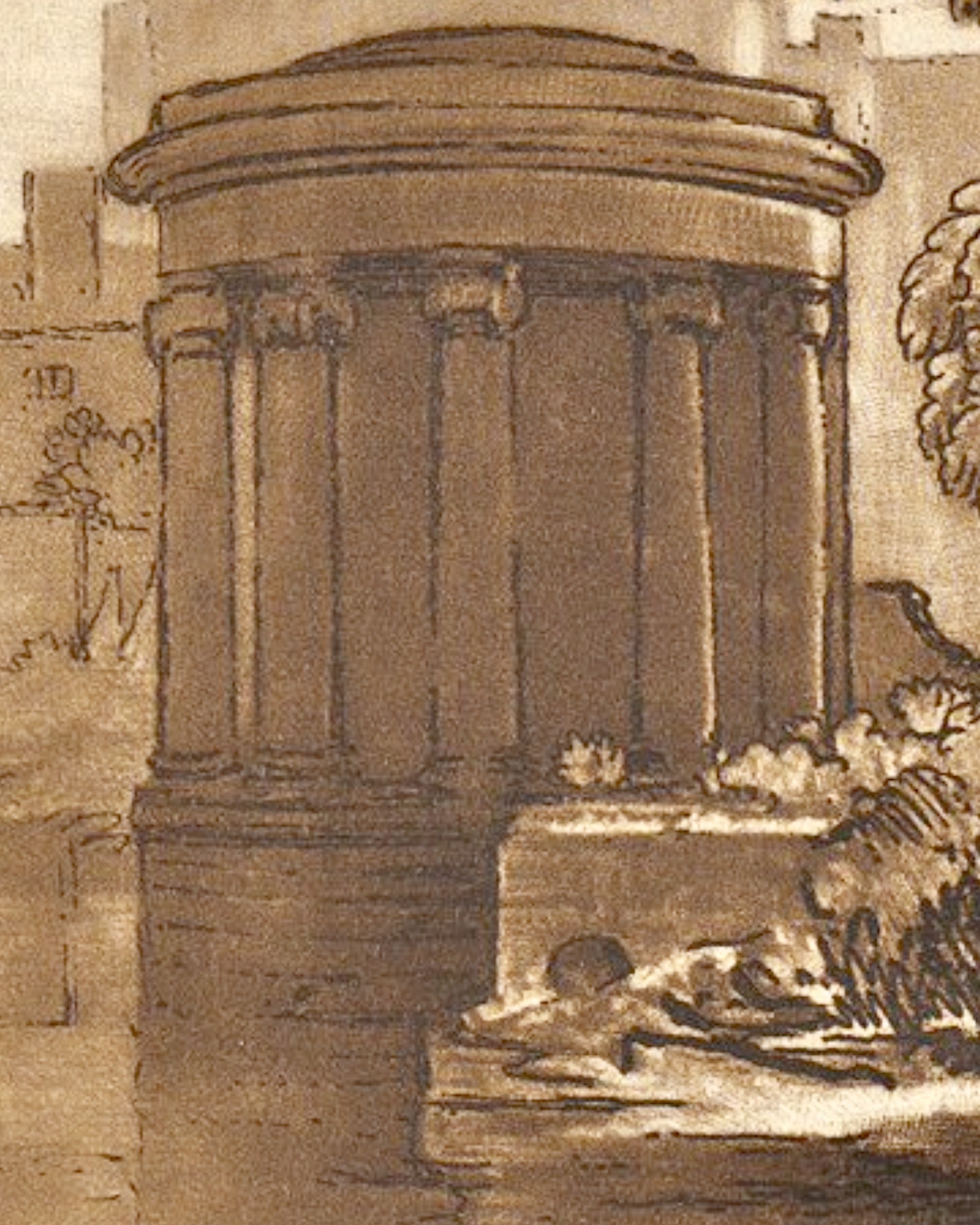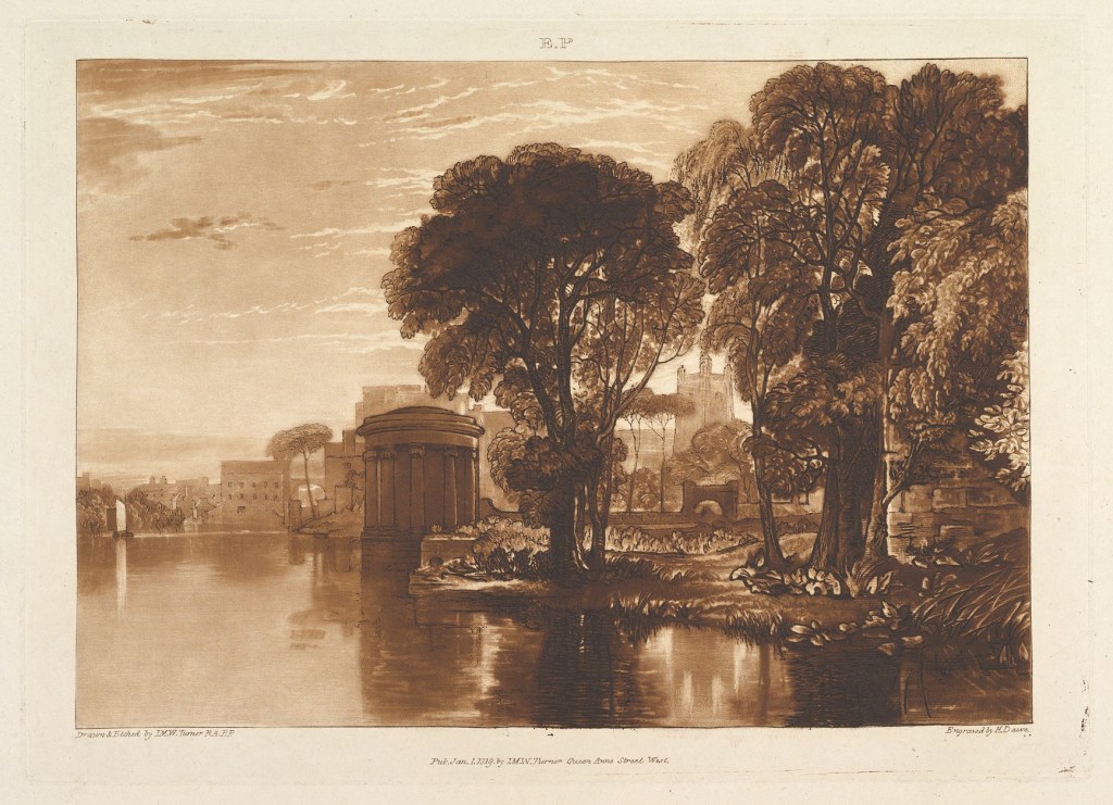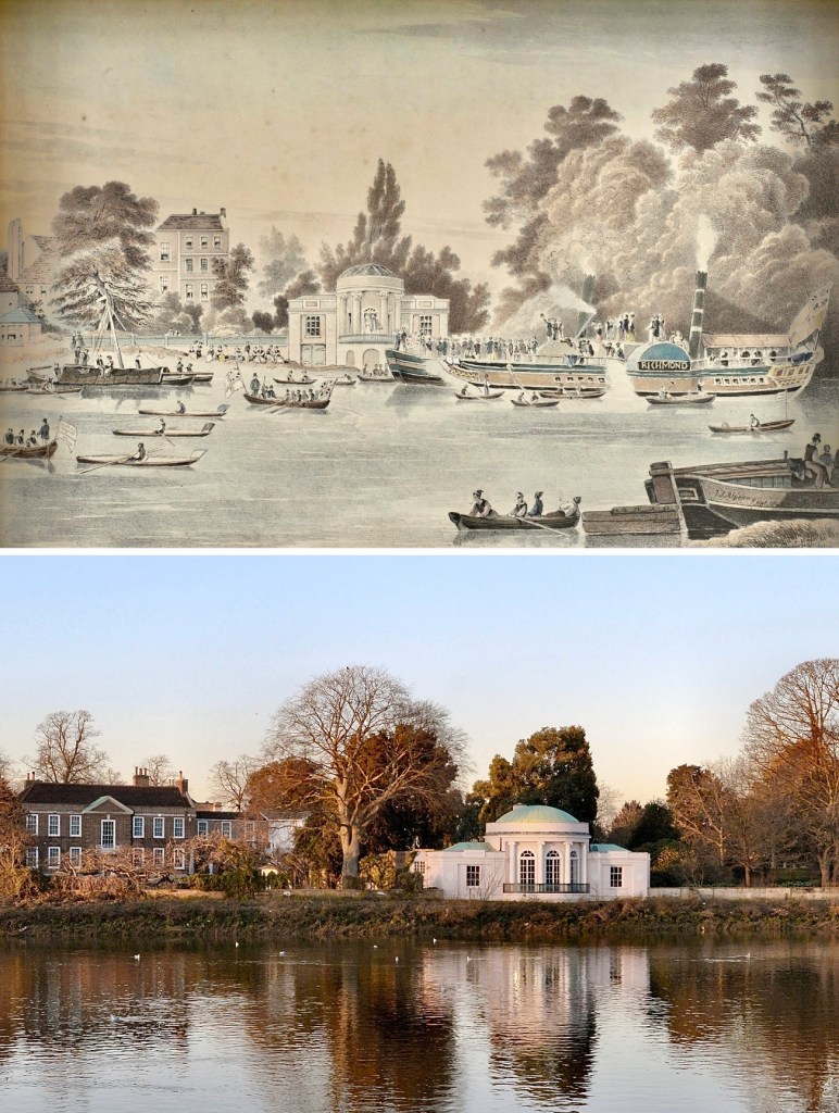 The composition had a particular, albeit unpublicised, significance for the artist. It shows the domed, Ionic boathouse-pavilion by Robert Mylne, built or completed in 1803 at the corner of the Duke of Northumberland’s Syon Park estate to the west of London, looking up the Thames to the riverfront at Isleworth. Turner moved here temporarily (between 1805 and 1806) renting Syon Ferry House… between the boathouse, sometimes called the Alcove, and the church.
