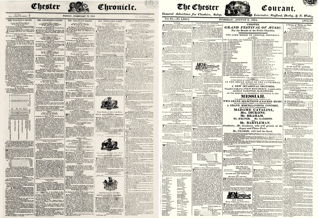 My main original sources are the Chester Chronicle (copies of which exist for 1775-1776 and 1789-1999) and the Chester Courant (published between 1776 and 1900 but copies are missing for 1807-1808, 1830 and 1872). To a lesser extent, I have also used the Cheshire Observer (1854-1989).