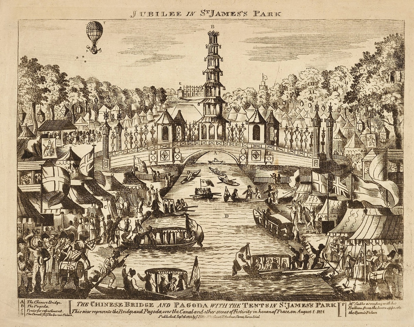 In 1814, Britain enjoyed “a summer of celebrations” to mark what appeared to be the final victory over Napoleon. In London’s St James’ Park for example, The Battle of the Nile was recreated by rowing boats on the canal crossed by a Chinese style bridge supporting a seven-storey pagoda. During fireworks, the pagoda caught fire and two men perished, but the crowd thought it was part of the celebrations and cheered the spectacle wildly. Two hundred miles away, Chester was also putting on lavish celebrations, some too on the water.