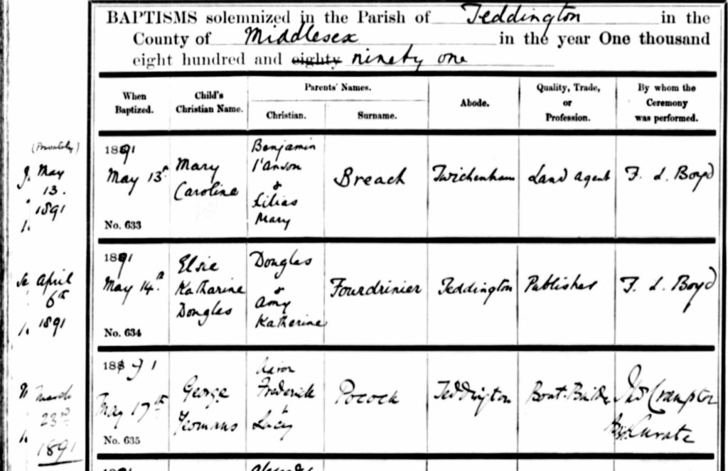 George was baptised on 17th May 1891 at St. Mary’s Church in Teddington. His baptism register entry confirms ‘Yeomans’ as his middle name and his date of birth is written in the margin.