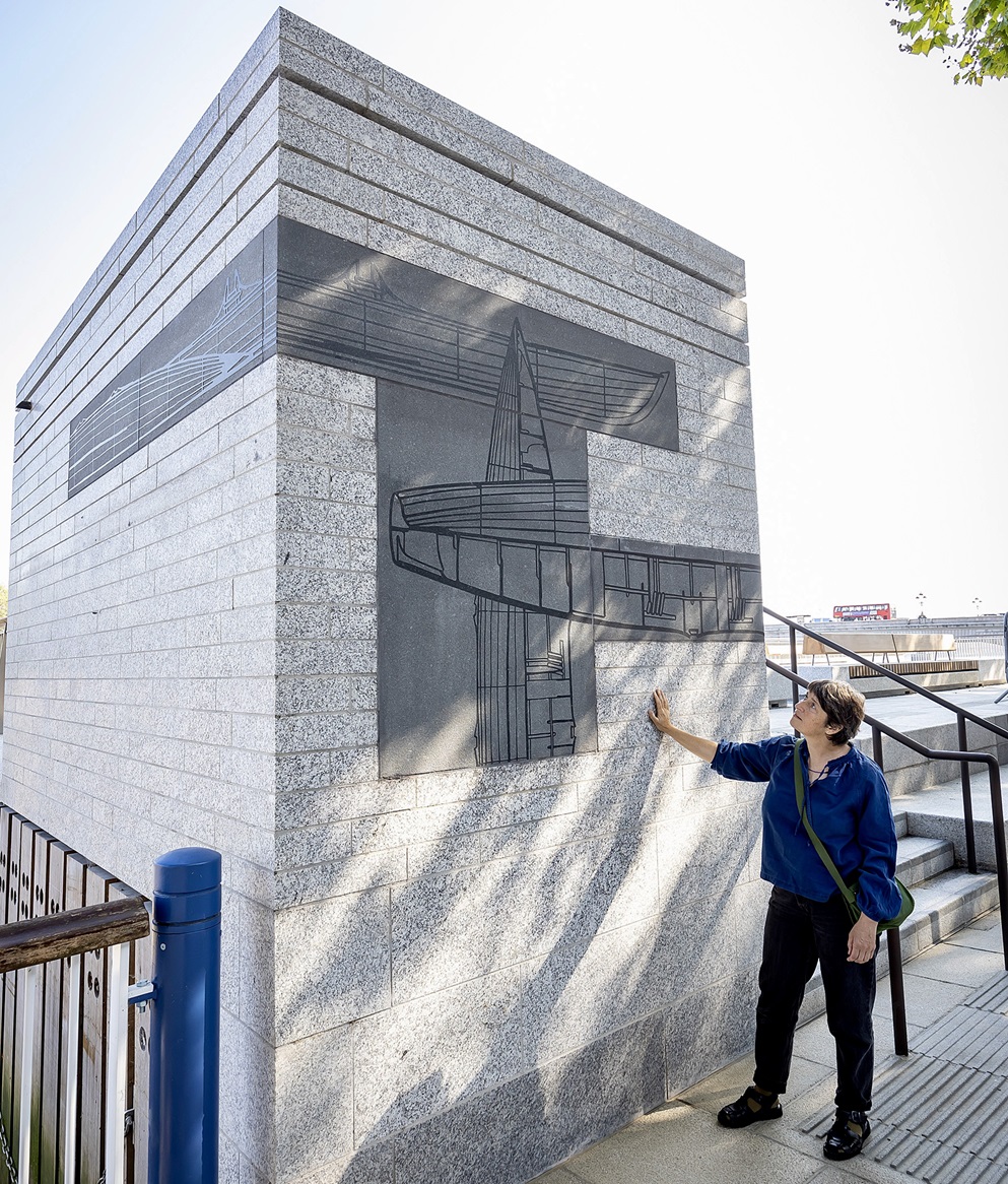 In a small building housing technical equipment, Barclay has created graphic artwork that has been sandblasted onto the granite walls.