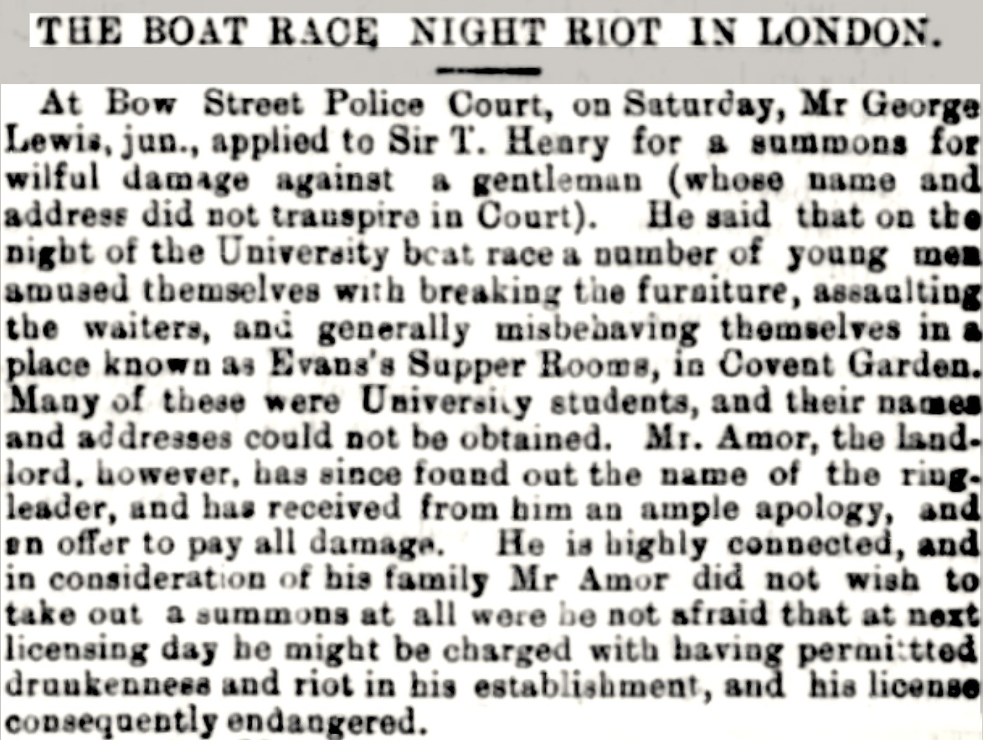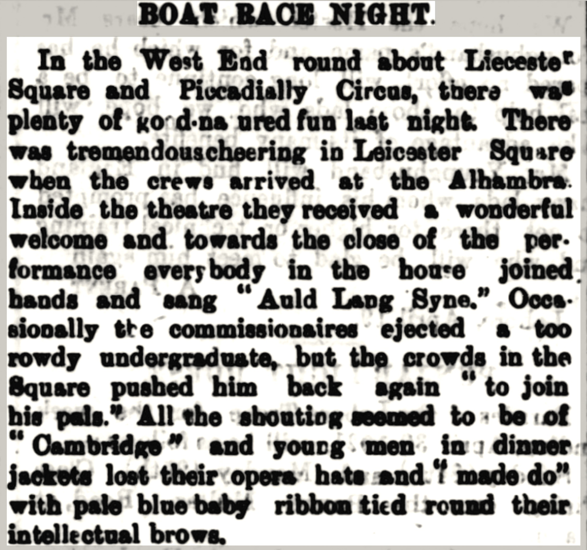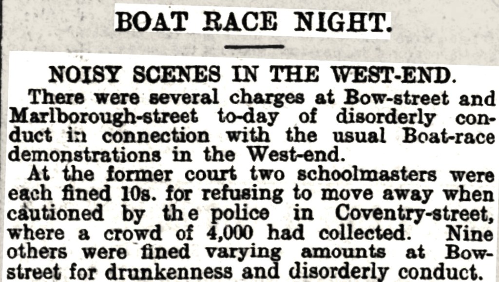 While it still may be premature to talk of Boat Race Day, it may be even more untimely to consider Boat Race Night. This is especially so as, in modern times, Boat Race Night is not “a thing” for most people. However, in years past, the hours of darkness following what was then one race saw riotous celebrations both by students and others in the West End of London that were, to current sensibilities, often rather shocking.