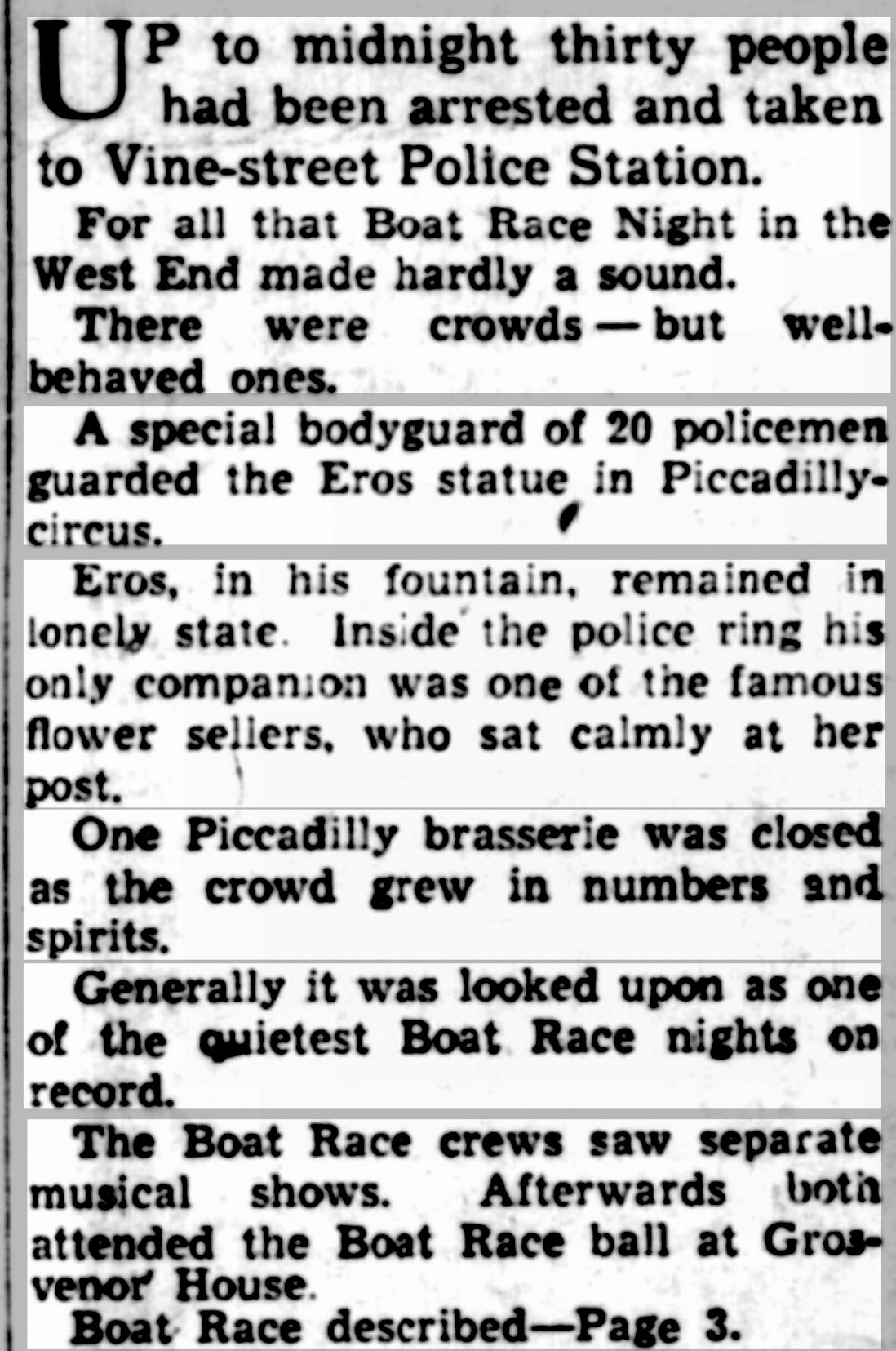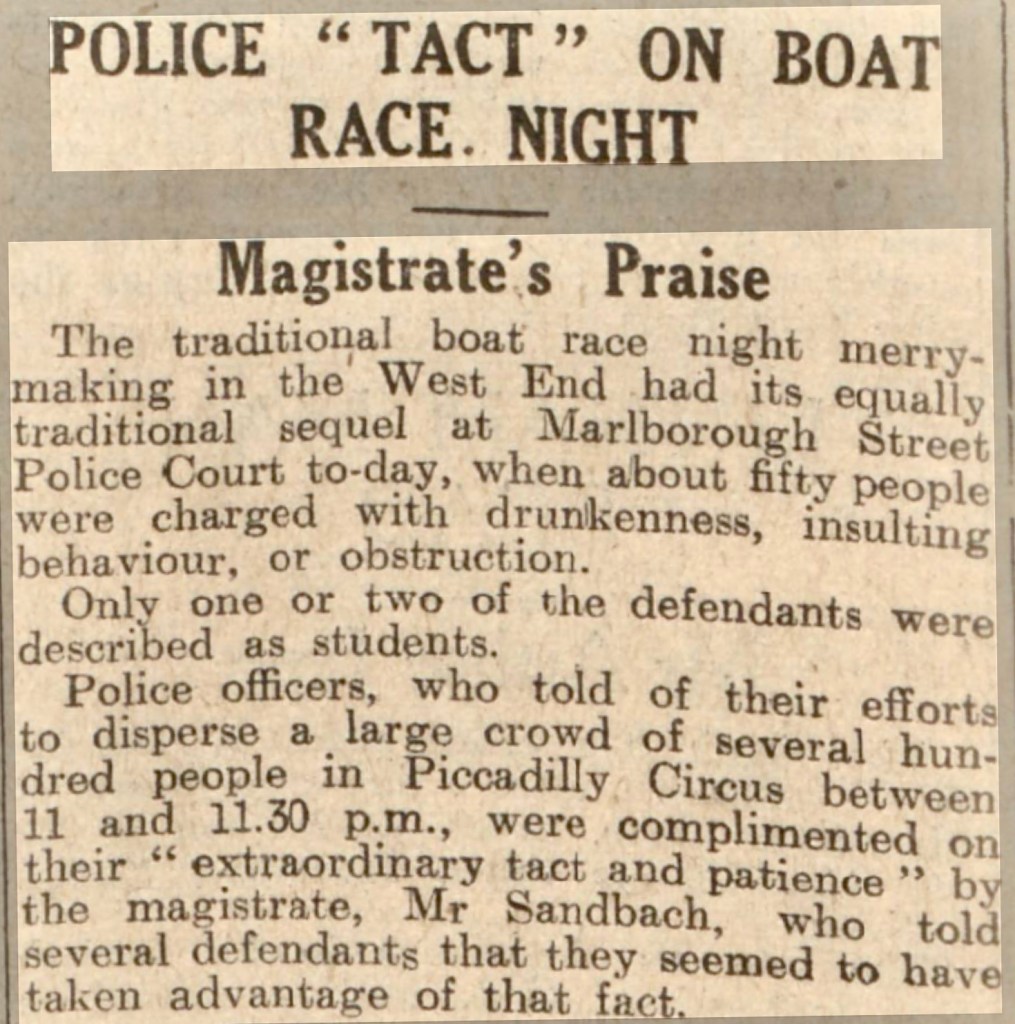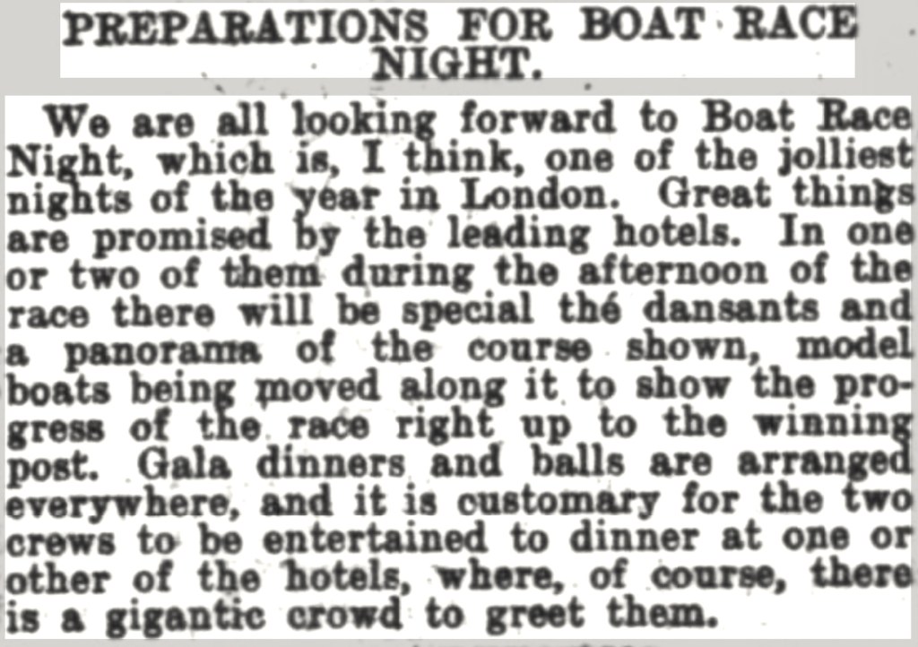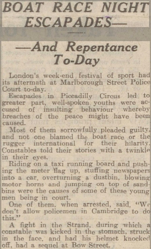 While it still may be premature to talk of Boat Race Day, it may be even more untimely to consider Boat Race Night. This is especially so as, in modern times, Boat Race Night is not “a thing” for most people. However, in years past, the hours of darkness following what was then one race saw riotous celebrations both by students and others in the West End of London that were, to current sensibilities, often rather shocking.