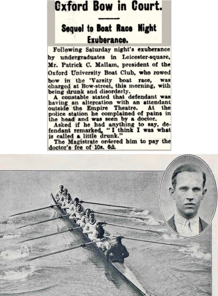 Another author writing at the same time, Arthur Ransome, has Oxford dropout Captain Flint, a character in one of his Swallows and Amazons children’s books, recount that he was once in jail on Boat Race Night due to high spirits (and) a fancy for policemen’s helmets.