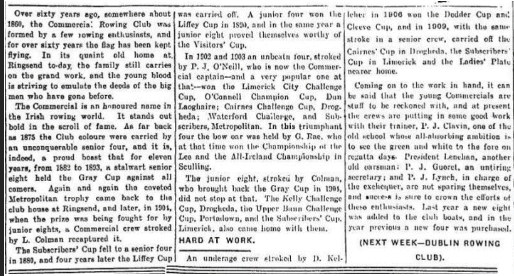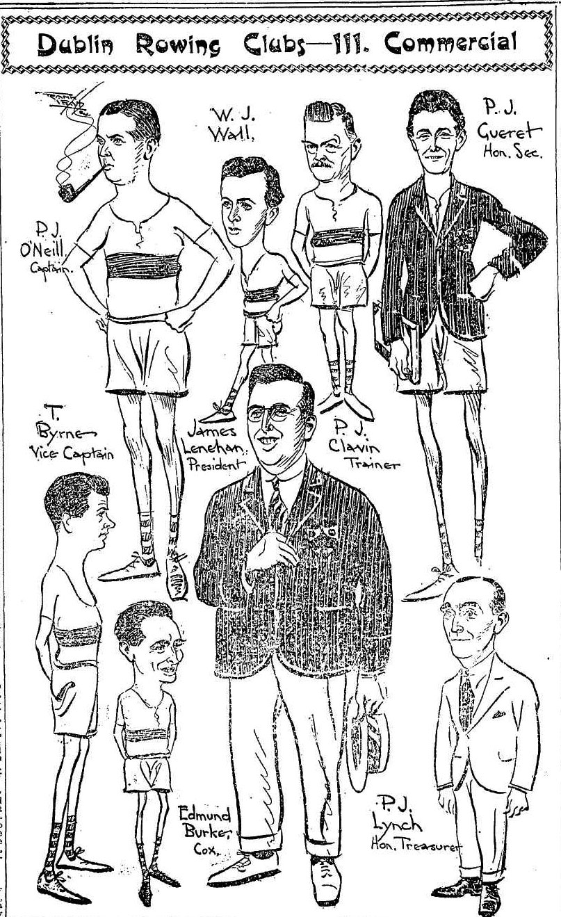I have Commercial Rowing Club, founded in 1856, to thank for discovering the existence of this series of sketches. Their website has a video history in which you can glimpse a copy of the above print. Unsurprisingly, the Saturday Herald incorrectly gives the club’s foundation date. That said, the rest of the article is a nice example of the pieces that accompanied Leah’s work. Clénet writes in his thesis that: “Drapers’ assistants and tradesmen gathered within the Commercial club”, whilst the video, which you can watch here, states that the club’s membership was city-centre orientated and made up of shopkeepers, employees of Clerys and of a lot of the other shops on Grafton Street. So, not quite ‘tradesmen’ as we know them in the rowing history sense.