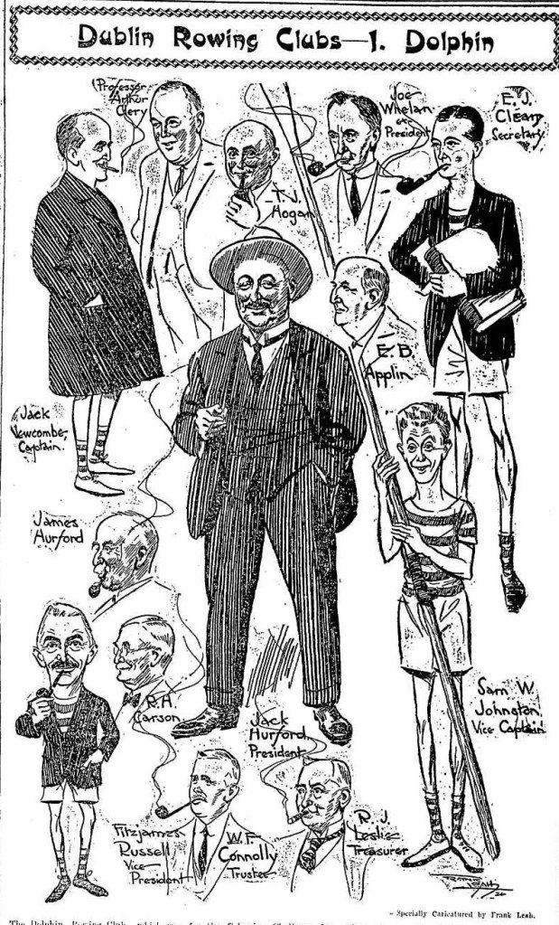 I included the above sketch in a previous HTBS article, A Shadow of Cloud on the Stream*, about Mr Justice William Evelyn Wylie. At the time, I thought it a one-off but was delighted to be proved wrong when I recently discovered that in 1924, the Saturday Herald had commissioned Leah to do a series of sketches of the prominent rowing clubs in Dublin.