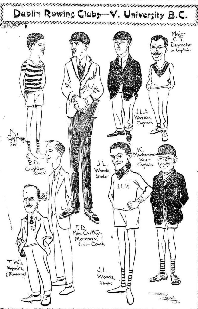 The fifth and final Leah cartoon featured members and ex-members of Dublin University B. C. Top right, we see C. T. Denroche who raced in the 1924 Tailteann Games in the colours of Lady Elizabeth Boat Club, the alumni club of University B. C. Presumably, J. L. Woods was so good they named him twice.