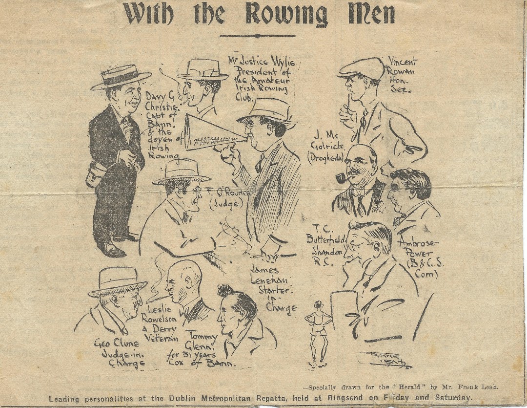 Leah was born in 1886 in Stockport, England. He was the eldest child of a large working-class family and left home, aged 15, and moved to Ireland. He worked as a cartoonist and caricaturist for several Dublin journals and newspapers specialising in theatre and political personalities. He also sketched at sporting events for the Saturday Herald, a weekend edition of the national newspaper the Evening Herald. It was during the restoration of rowing back to its pre-war popularity that Bob Moore’s and Frank Leah’s paths, or perhaps towpaths, crossed.