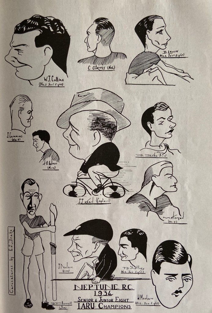 Ten years after Frank Leah’s work appeared in the Saturday Herald, Neptune Rowing Club had reason to call on unknown artist (at least to me) E. J. Drake, to immortalise one of their greatest ever crews. The crew began the 1934 season as six juniors and two maidens, they raced unbeaten that year, winning in Drogheda (Boyne), Cork, Limerick, and New Ross where they won the inaugural Junior Eight Championship of Ireland. The club’s captain, Jack Kean, asked them if they would like to try and finish the season unbeaten (by winning at Dublin Metropolitan Regatta) or to step up and race for the Senior Eight Championship title at the same event. They chose to go for the big one – not an easy task considering Dublin University Boat Club had a very fast crew that lost the final of The Ladies’ Plate at Henley by three feet.