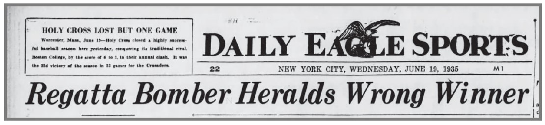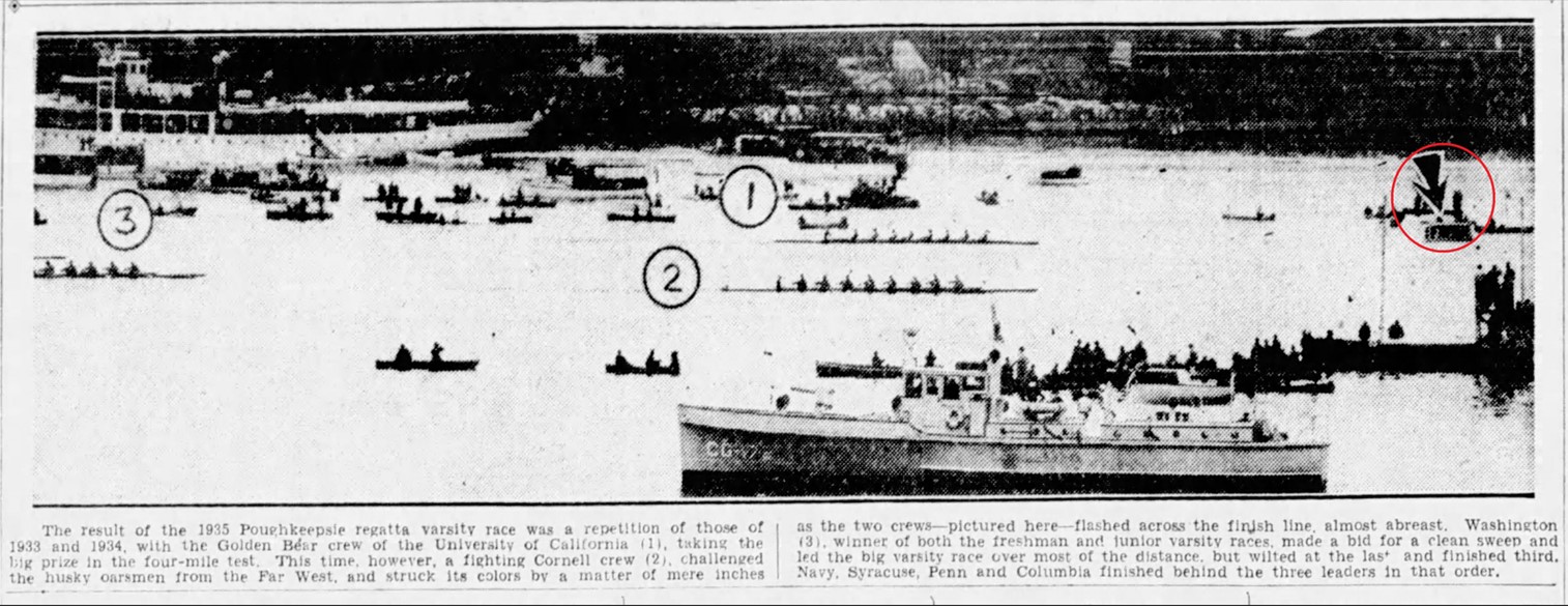 With that year’s work done he headed back to La Bella Napoli, his Main Street pizzeria and tavern in Poughkeepsie, leaving behind “a tidal wave of argument and confusion unparalleled in the forty-year history of this Hudson River classic.”(Chicago Tribune, June 20, 1935) It took California coach Ky Ebright two trips to the judge’s barge before being told “We don’t care how many bombs were exploded or how the flags were arranged, California and not Cornell won.”(Chicago Tribune, June 20, 1935) Newsreel footage would eventually confirm the judge’s decision. Mike would learn of his error later that night.
