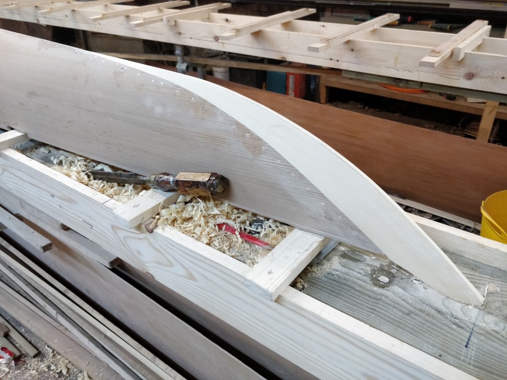 The boat was being built as a complete replica of the Pocock built Husky Clipper which was used by the winning 1936 crew featured in the Daniel James Brown’s book. The original boat still exists and hangs in the ceiling of the University of Washington boathouse. To make matters easier, the WinTech company had scanned another Pocock eight from 1937 that had survived at a US school and a detailed set of hull lines were available for Bill’s team to follow. All the details of the framing and fittings were worked out from many photographs of the original boat.