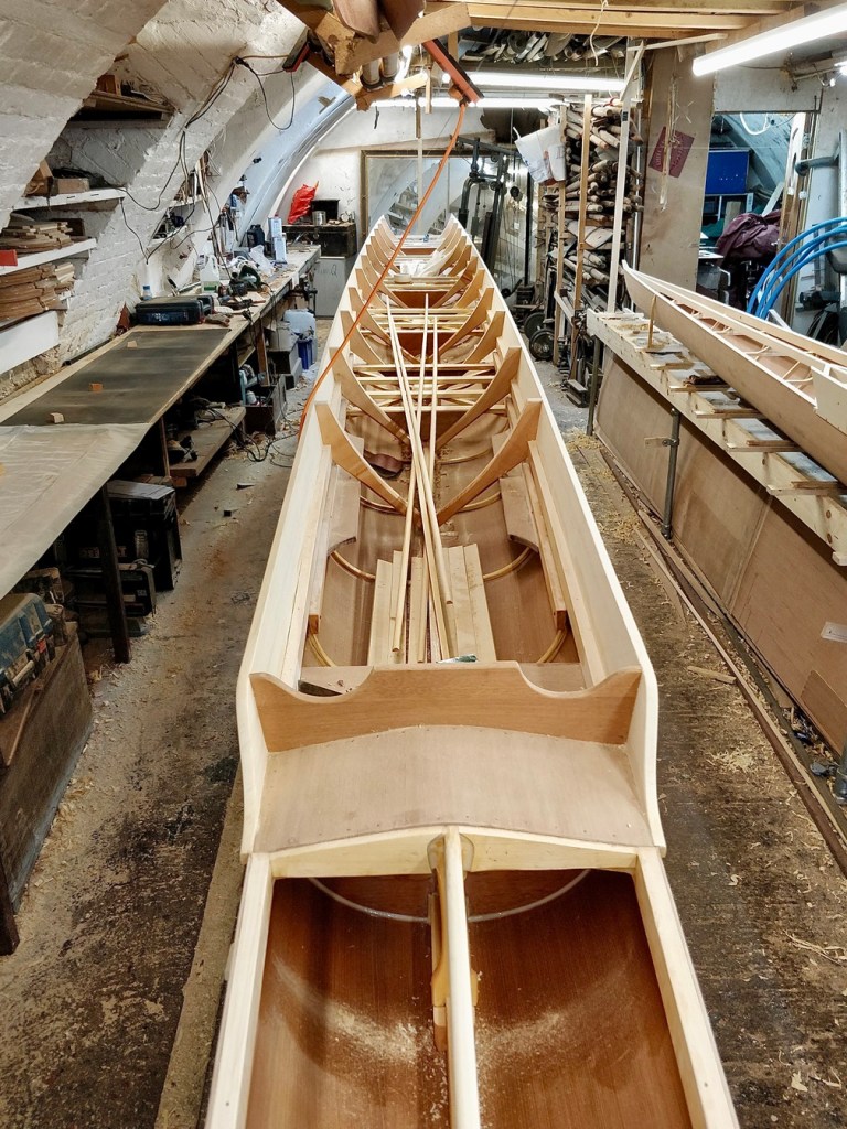 On the side of the Thames, Mark’s team were busy finishing off the large training barge used in the film. Hidden away in the Richmond Bridge vaults directly beneath the road, another boat was taking shape. Under the guidance of Bill Colley, one of the few remaining timber racing boat builders, the frame of a timber eight was being readied for its plywood skin.