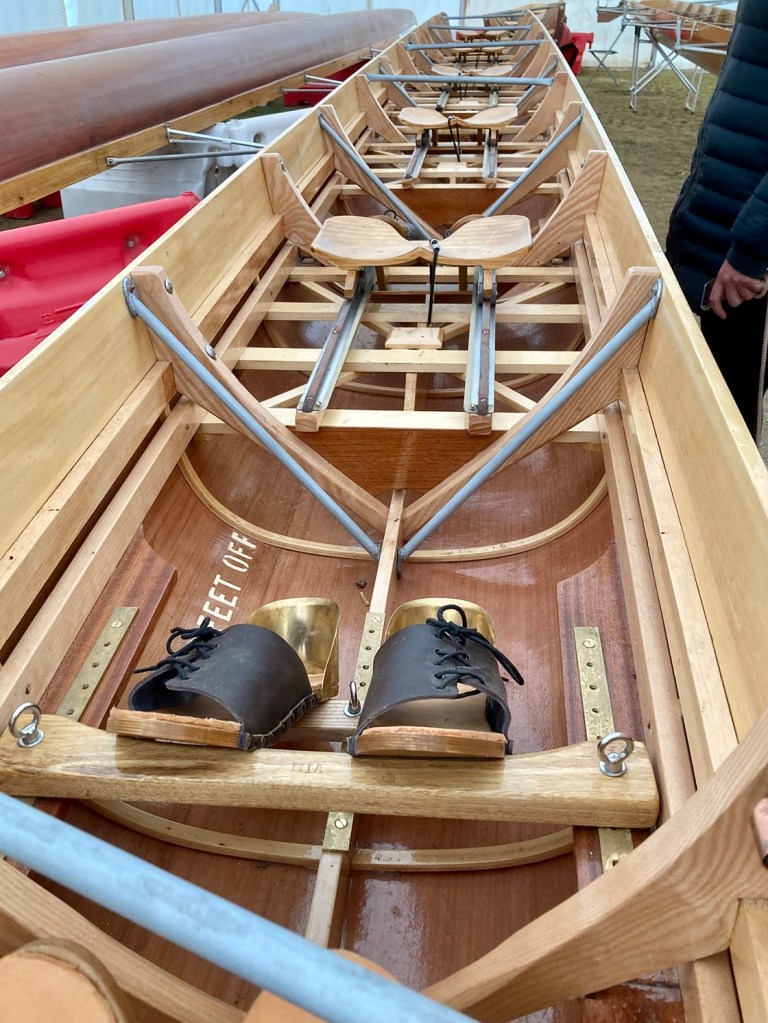 It didn’t take long to discover that this was a very different experience to rowing in a carbon fibre, modern shell. The angle of the riggers, the length of the track, the placement of the foot blocks were all completely different. I’m 6’6” and I couldn’t get my knees down despite hitting the back of the track at the finish. This combined with the much lower height of the rigger and gate meant that I couldn’t physically get my oar out at the finish, and needed to stay feathered until the final second at the catch. I caught so many crabs that I could’ve started a fishmongers. It took Terry O’Neil some late nights in the boathouse to make the necessary adjustments that allowed us all to translate what we’d learned in training to the new boat.
