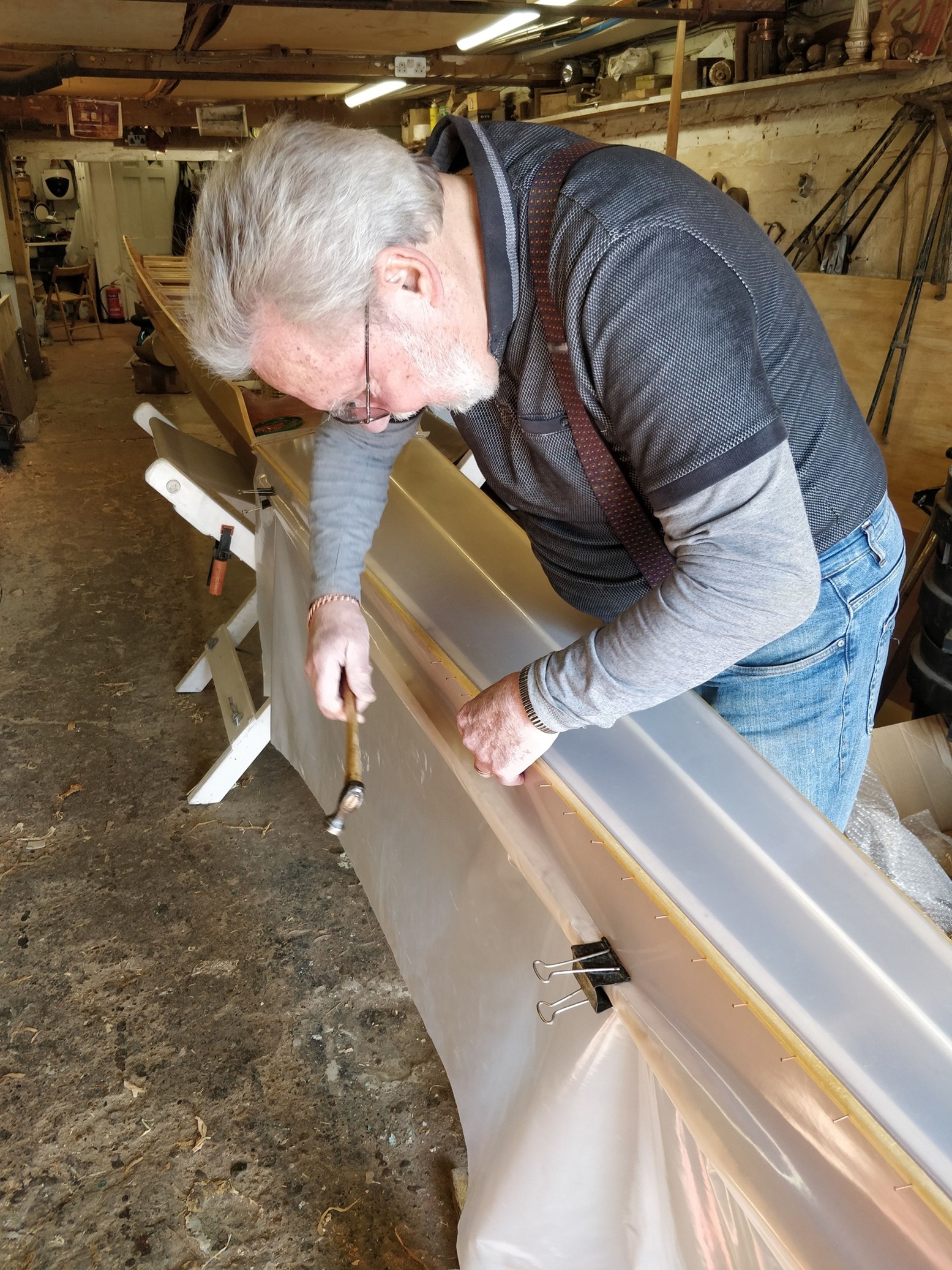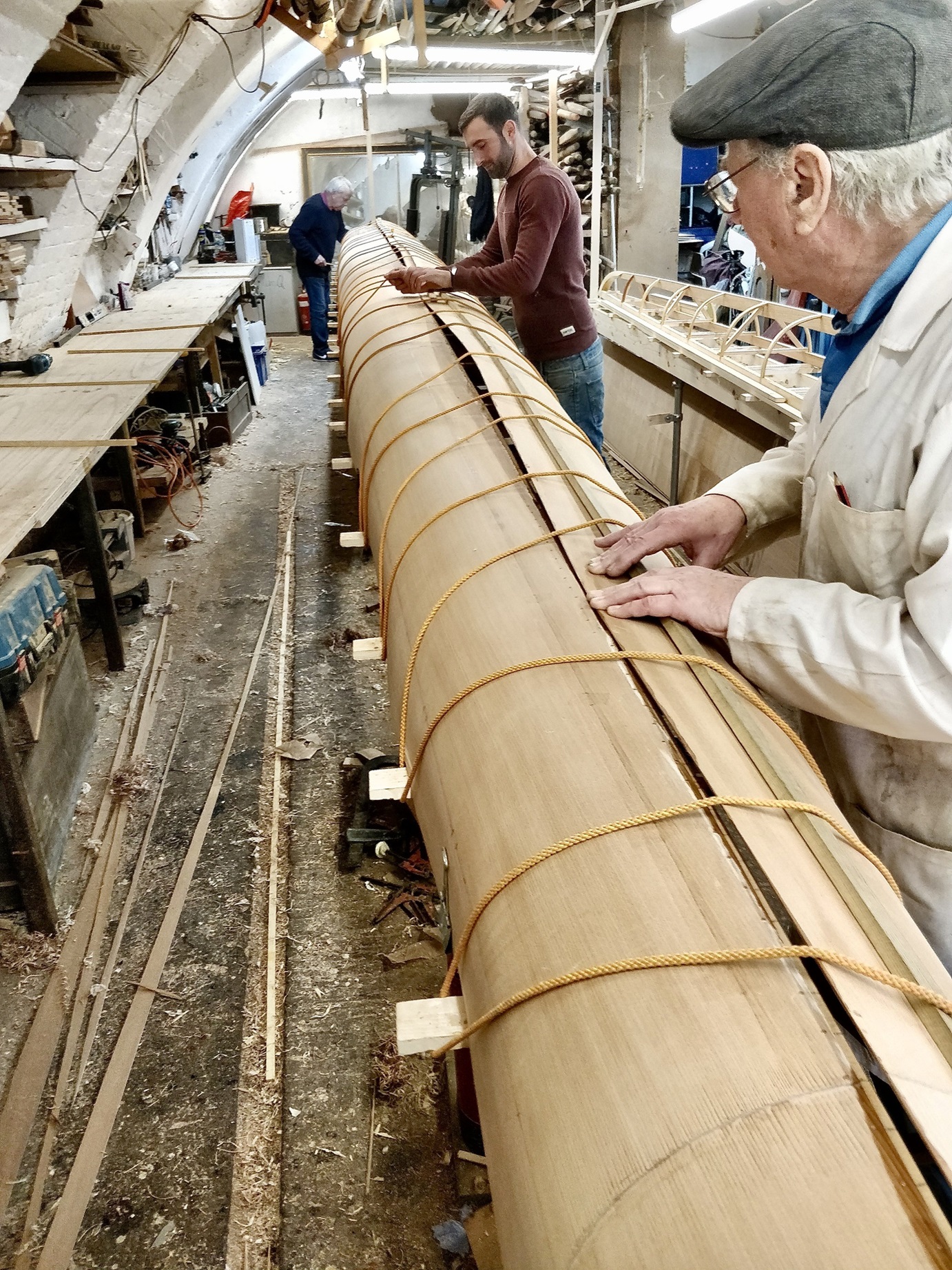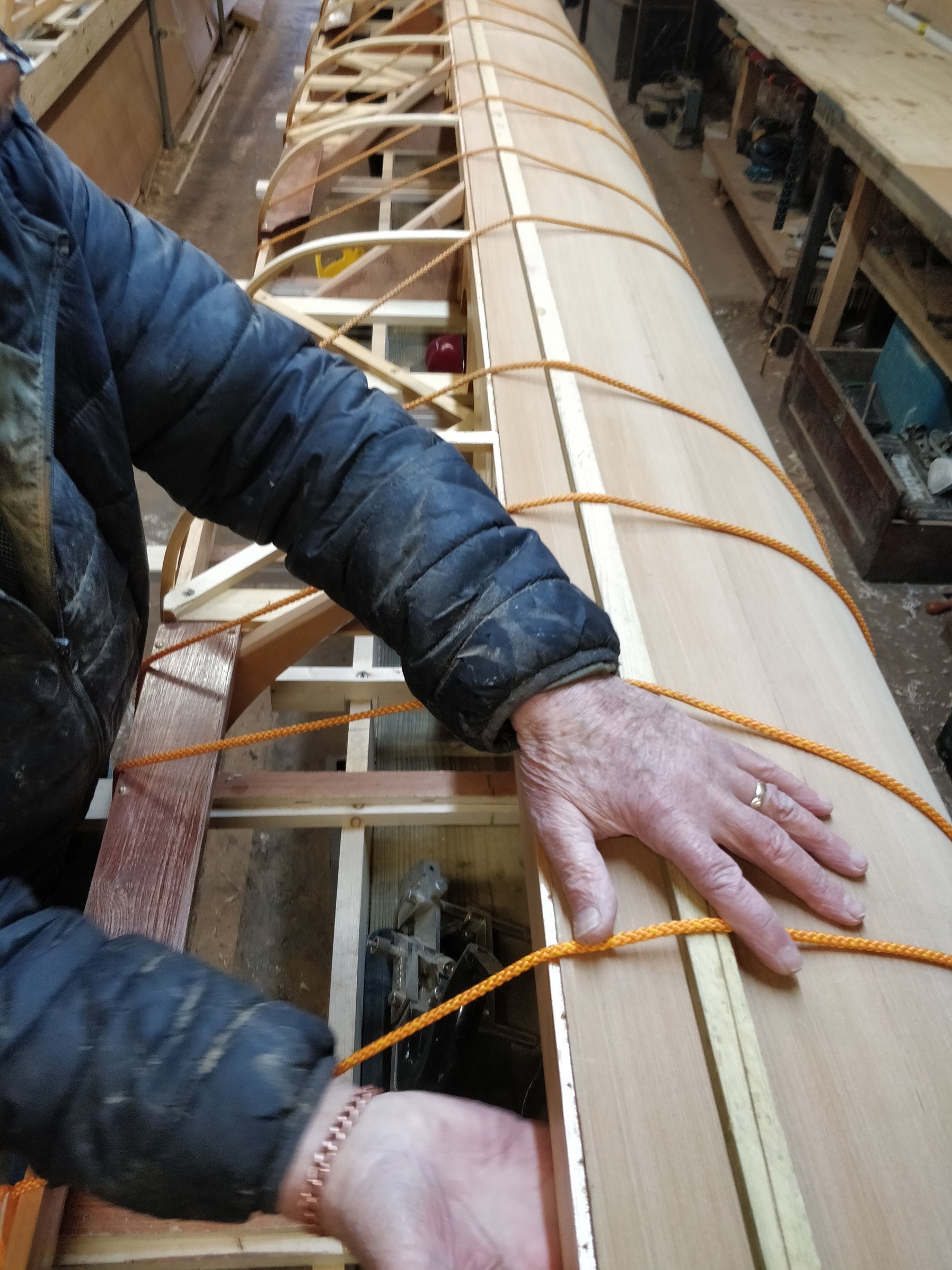 With Graeme’s advice in mind, I asked Mark and Bill if I could come to assist when it was time to put the skins on the eight. The chance to get hands-on experience with these traditional techniques was not one to be missed. Mark said it was up to Bill, and luckily Bill was happy for me to join his small team. Mark pointed out that, “No one is ever going to do this again, so you’d better join in.”
