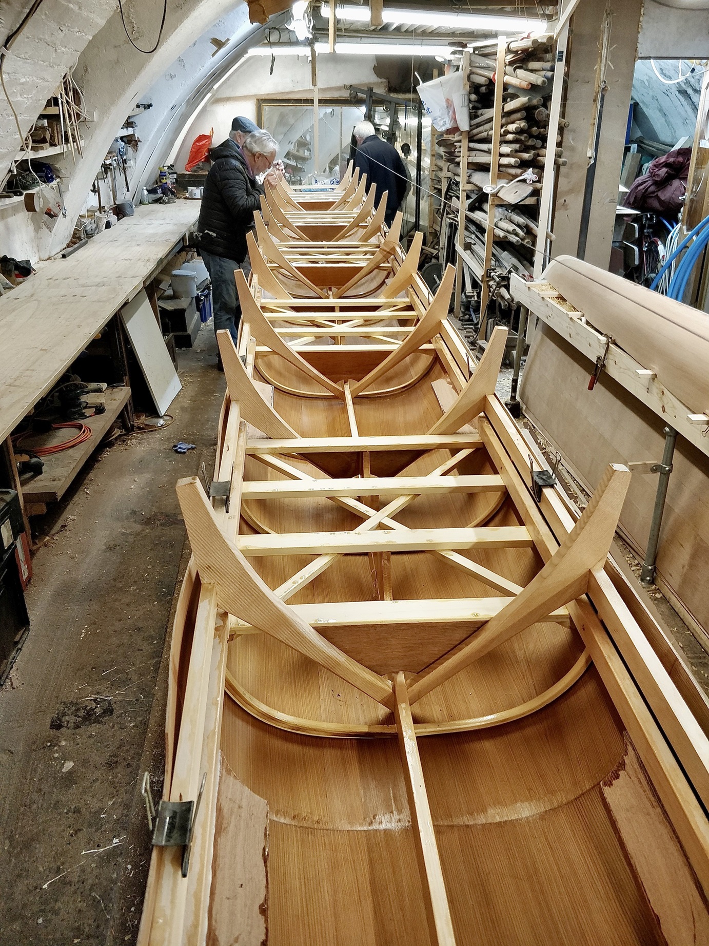 On the side of the Thames, Mark’s team were busy finishing off the large training barge used in the film. Hidden away in the Richmond Bridge vaults directly beneath the road, another boat was taking shape. Under the guidance of Bill Colley, one of the few remaining timber racing boat builders, the frame of a timber eight was being readied for its plywood skin.